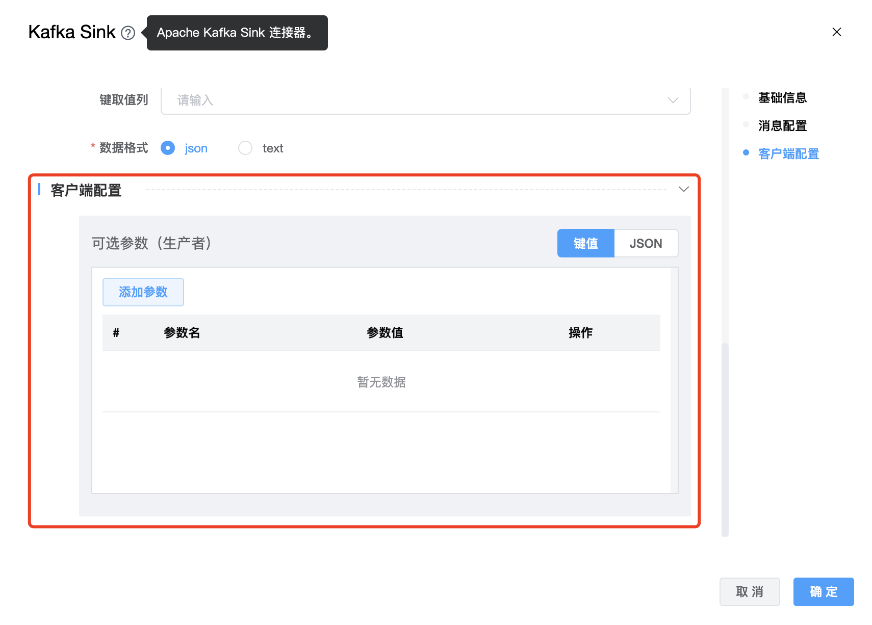 | 节点编码 | 当前创建的 Kafka Sink 节点编码,由用户自定义且不可为空。命名可包含字母、数字、下划线。 |