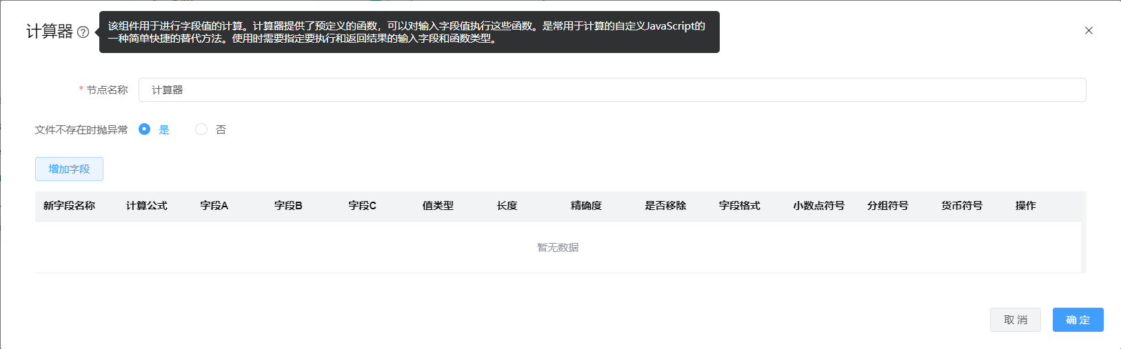 | 文件不存在时抛异常 | 是否当字段A, B, C中提供文件不存在时,抛异常。该选项针对如CRC-32类即(计算公式名称带file名称)需要提供file计算公式使用 |