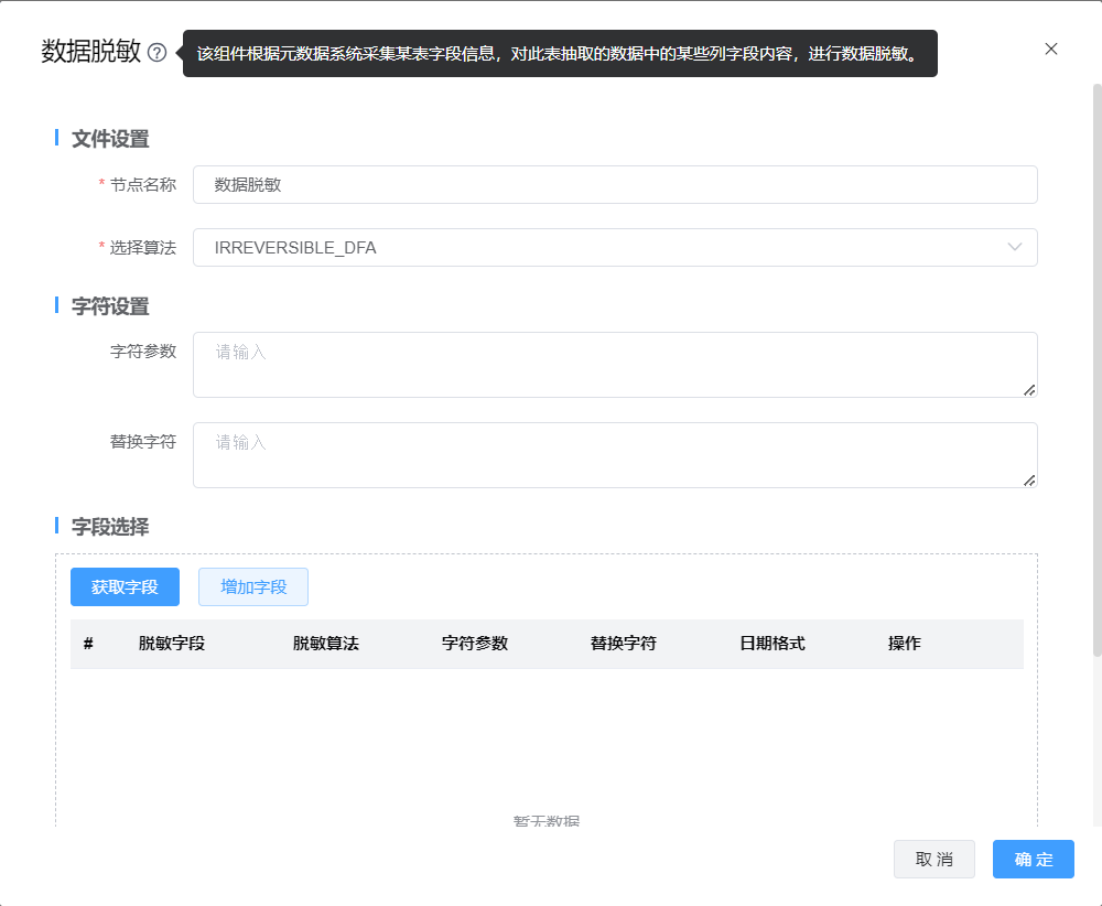 | 字段 | 脱敏字段:从前置步骤输出流中选择需要脱敏的字段 |