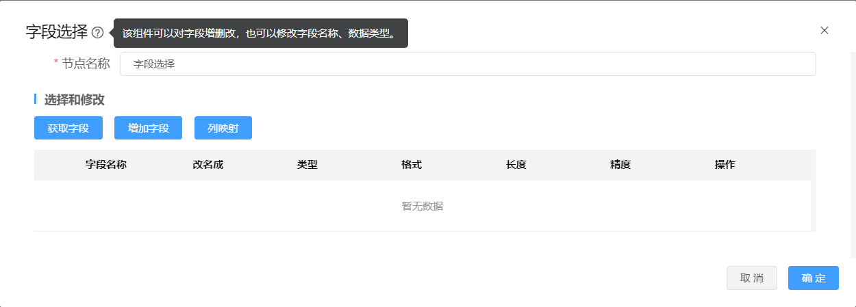 功能介绍:字段选择可以对字段增删改,也可以修改字段名称、数据类型。从输入流中选择部分字段,修改字段名称、类型,并将选择的字段输出到下游组件,当字段比较多时,可以用来做过滤和修改操作