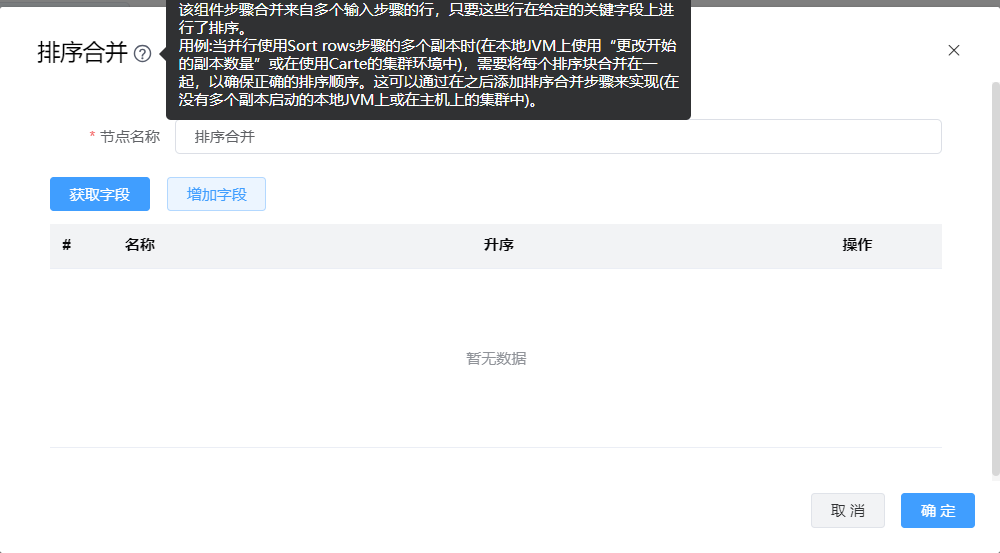 功能介绍:排序合并用于合并来自多个输入步骤的行,只要这些行在给定的关键字段上进行了排序,接收多个输入流,根据指定字段对合并后的输入流进行排序。