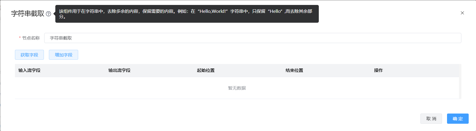 功能介绍:字符串截取用于在字符串中,去除多余的内容,保留需要的内容,从输入流中选择字段,根据指定值进行截取,并将截取后值,放到新字段中,输出到输出流。例如:在“Hello,World!”字符串中,只保留“Hello”,而去除其余部分。