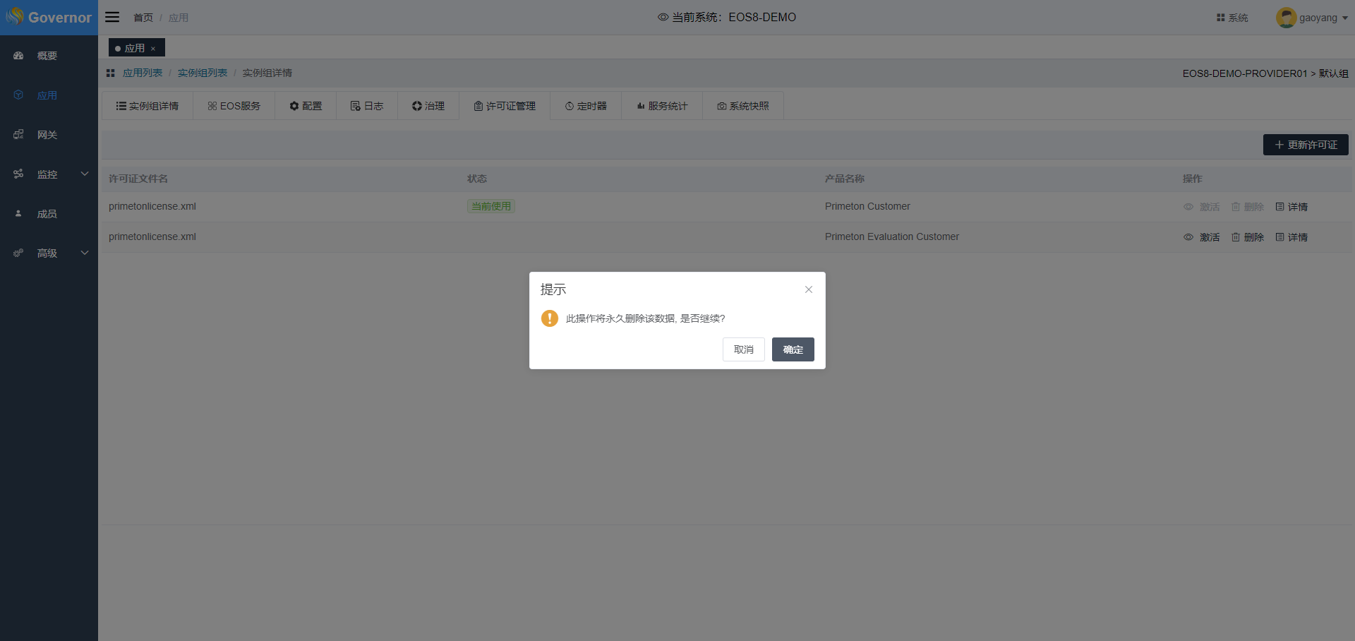 激活成功后,即可使用最新license(用户可上传多个许可证,但是只能激活一项),激活成功后,应用需要重新启动