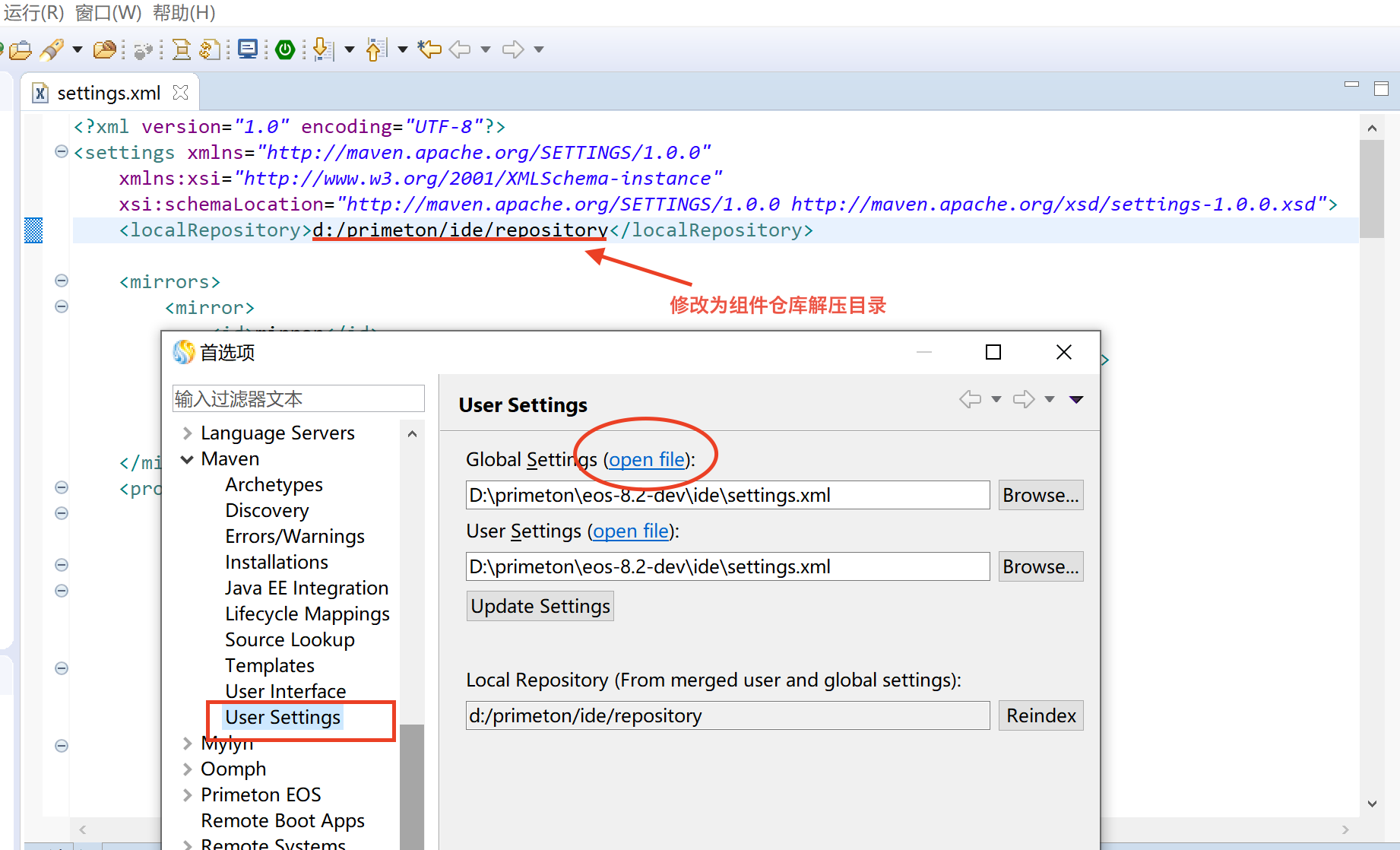 启动 ide\eclipse\eclipse.exe 打开菜单 "窗口” - “首选项” 找到 "Maven" - "User settings"