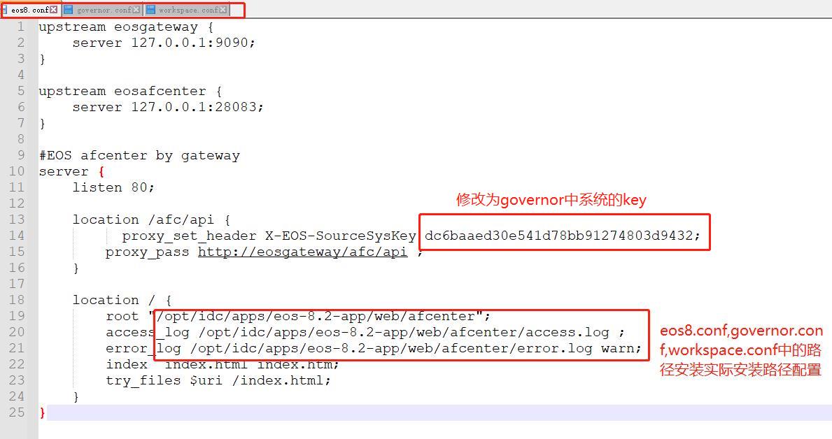 修改前端nigix代理配置文件,文件路径/opt/idc/apps/eos-8.2-app/web/conf 默认解压路径为/opt/idc/apps/eos-8.2-app 默认解压无需任何文件修改 非默认路径解压需修改以下文件配置