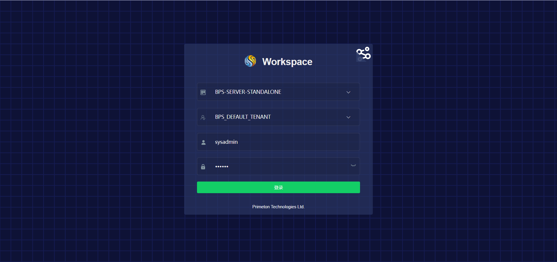 登录验证 访问Workspace登录地址(http://127.0.0.1:31199 sysadmin/000000)选择BPS流程引擎服务及BPS默认租户(首次加载页面需刷新)