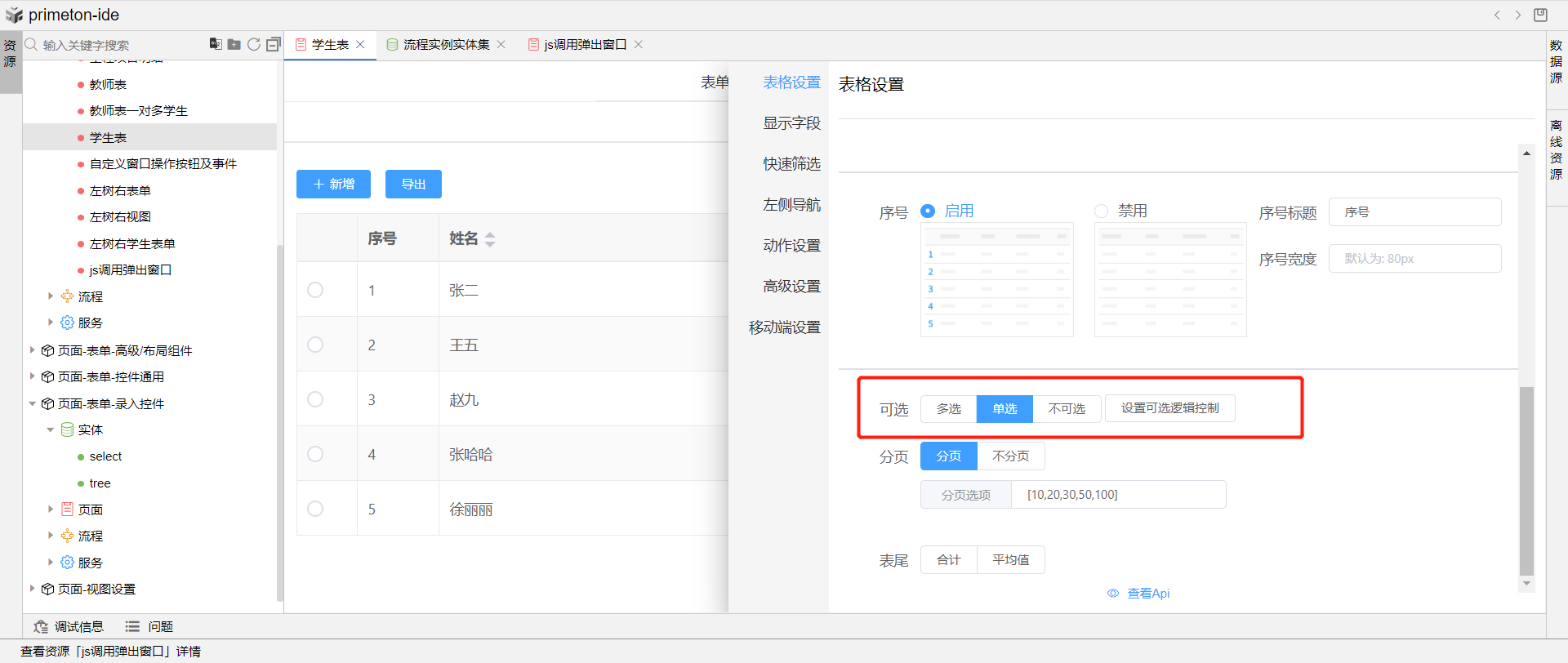 1.在学生表单中新建一个学生默认视图3单选,打开视图设置,点击表格设置中可选设置,切换为单选模式。