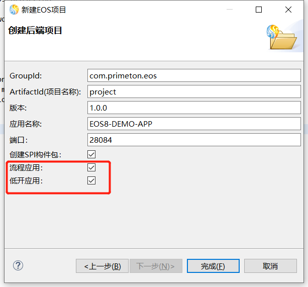 1.打开studio开发工具,选择创建EOS项目,创建时勾选流程应用与低开应用