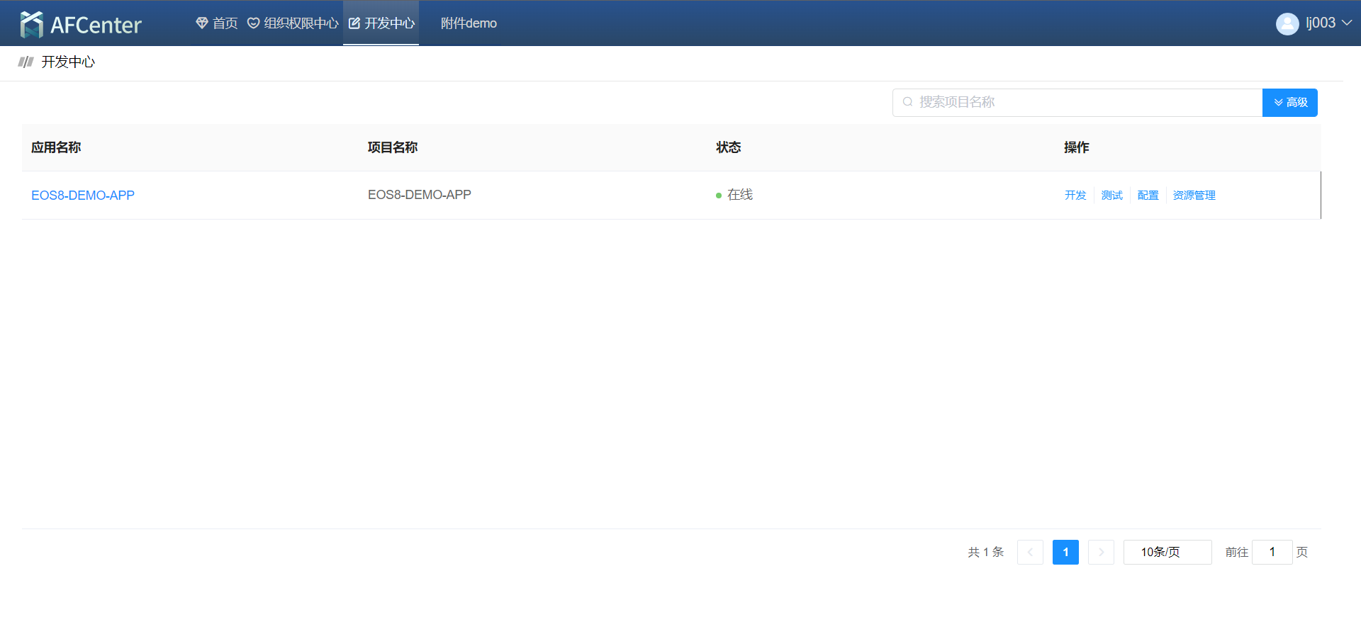 7.完成以上配置,重启nginx,进入AFCENTER开发中心菜单下,即可看到刚刚创建的低开应用。默认创建者为低开项目管理员,点击项目上的开发按钮,即可进入IDE开发界面。