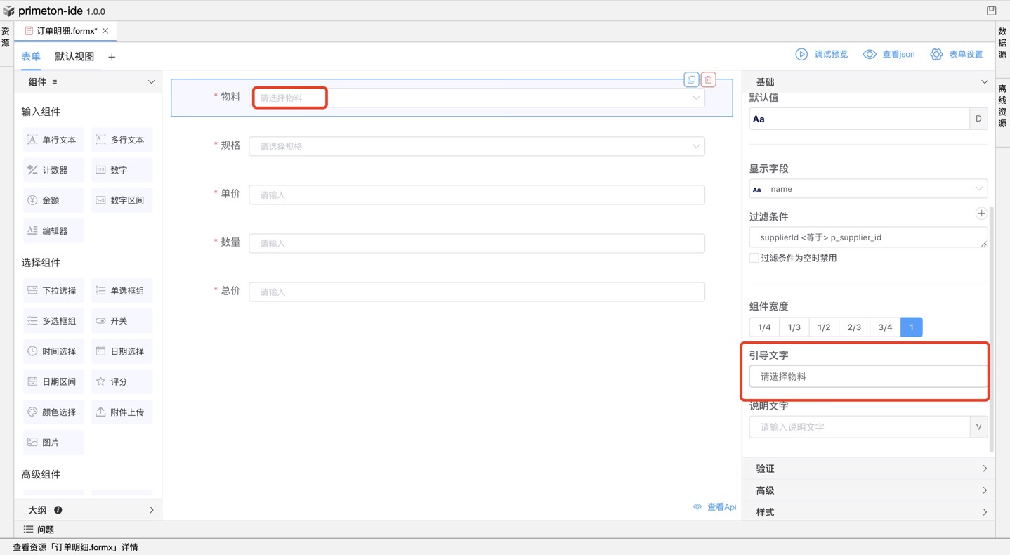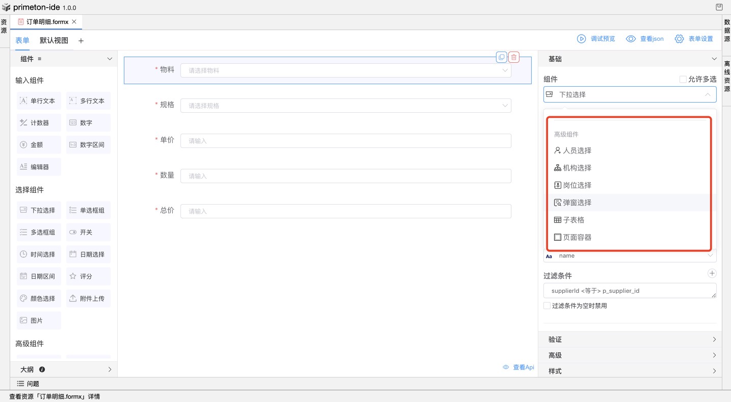 当组件选择“下拉组件”或“单/多选框”等选择类组件时,可指定数据来源,以关联已添加编辑的数据集。