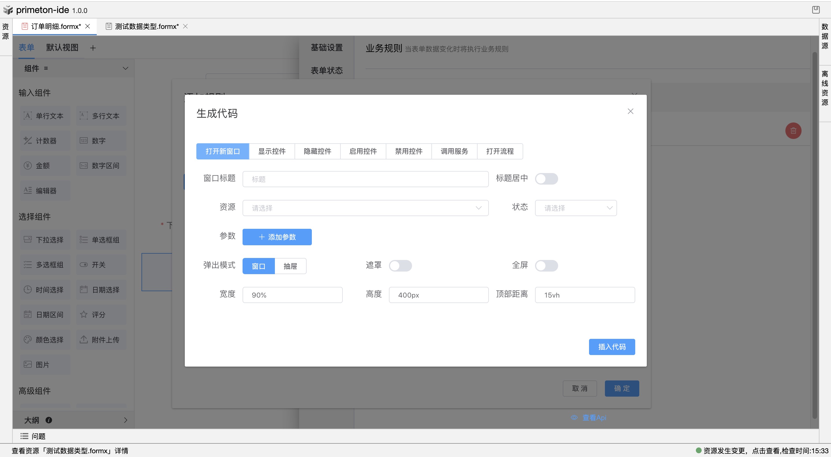 该项指明当前表单页面的实体, 鼠标移上去可查看实体全称(构建包.实体集.实体),点击“查看实体”可跳转资源详情。 查看实体 跳转实体资源