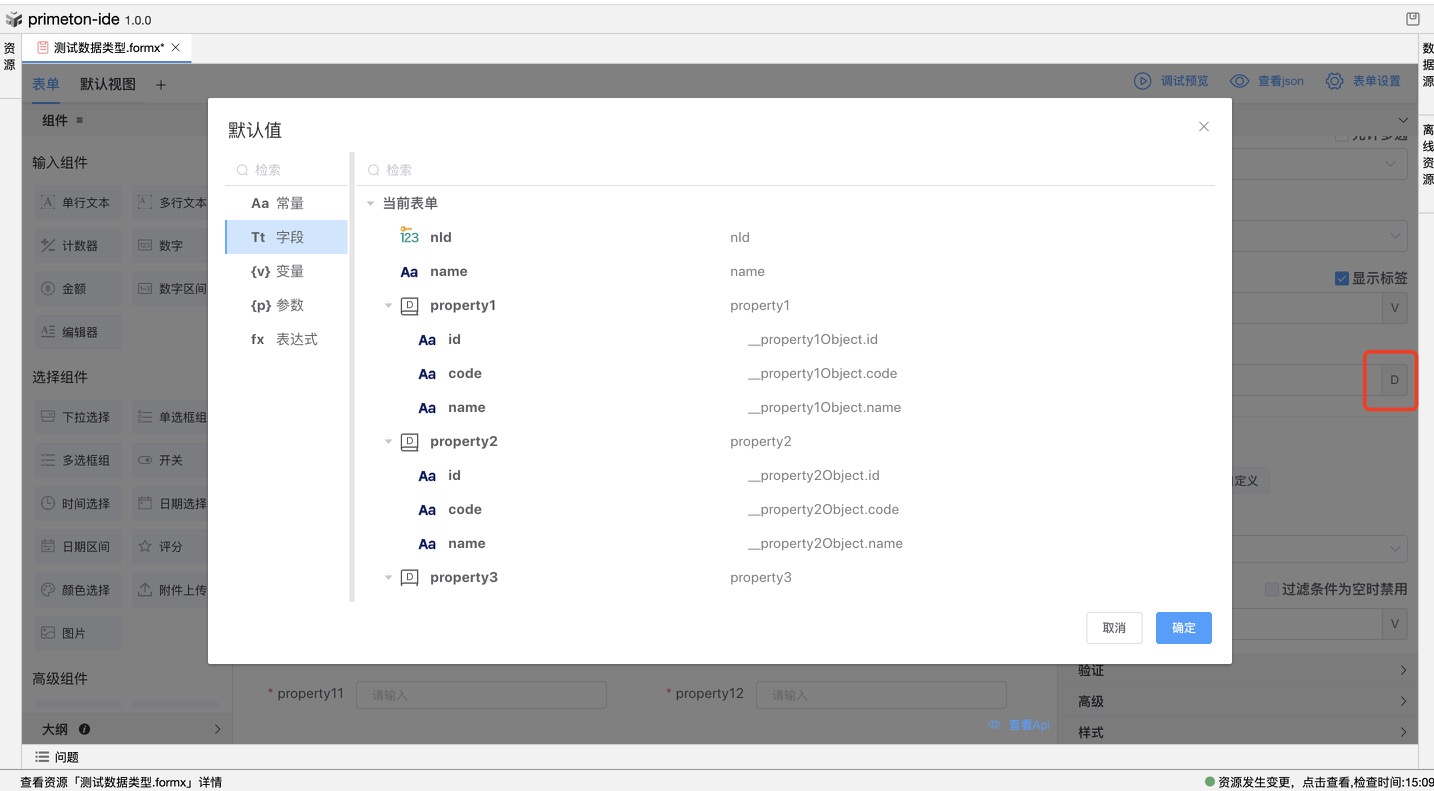 默认值01 预览效果: 默认值02 也可绑定变量(可设置常量、绑定表单字段、绑定变量、参数或者自编辑表达式): 默认值03