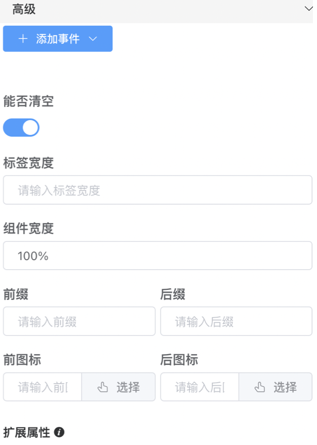 “高级设置”中可以添加编辑“方法”,定义一些参数的处理;也可以自定义添加“外部参数”;可以定义“事件”触发处理动作;也可以对表单属性设置“监听”以根据属性值的变化进行数据处理;还可以定义“计算属性”,设置get、set事件;可以添加自定义的“内部变量”。