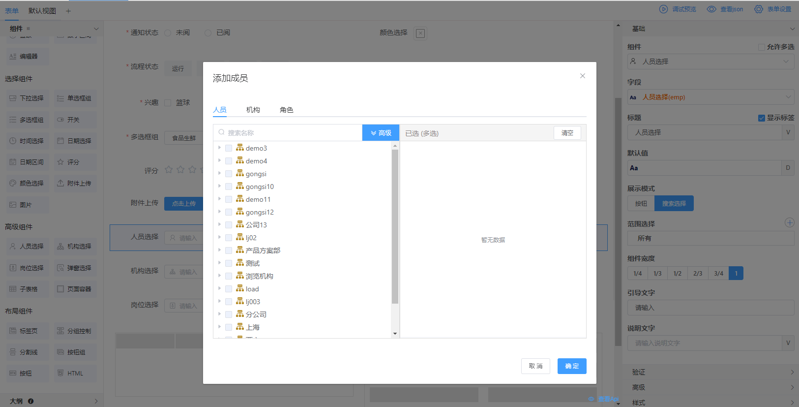 • 基础-范围选择,默认所有可选,展示所有机构的树形模式。如需限制机构范围,可以如下操作(类似人员选择)