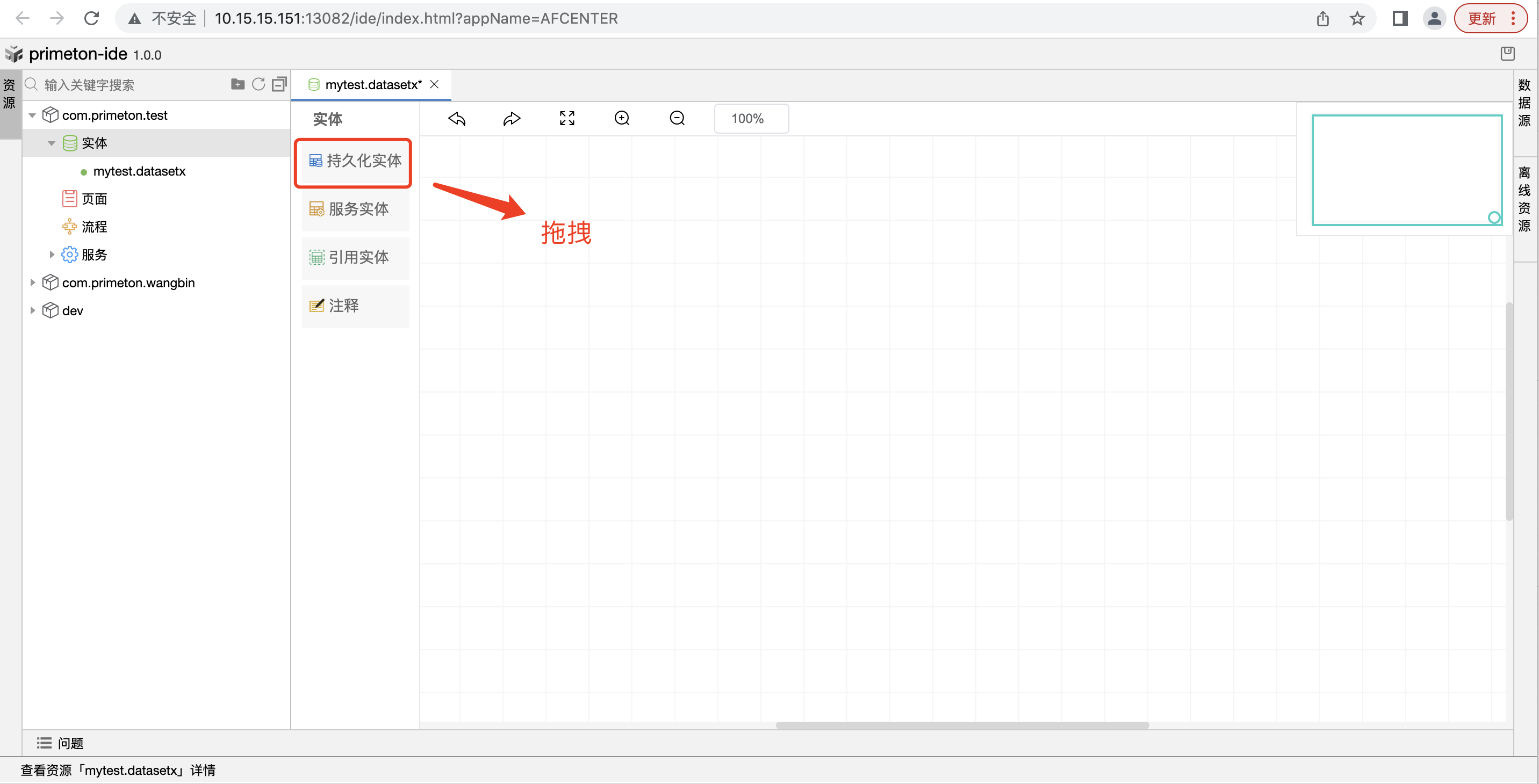 引用实体还可以从资源树中,选择其他实体集的持久化实体,拖入到画布中。示例是从test实体集拖入实体到本实体集中。