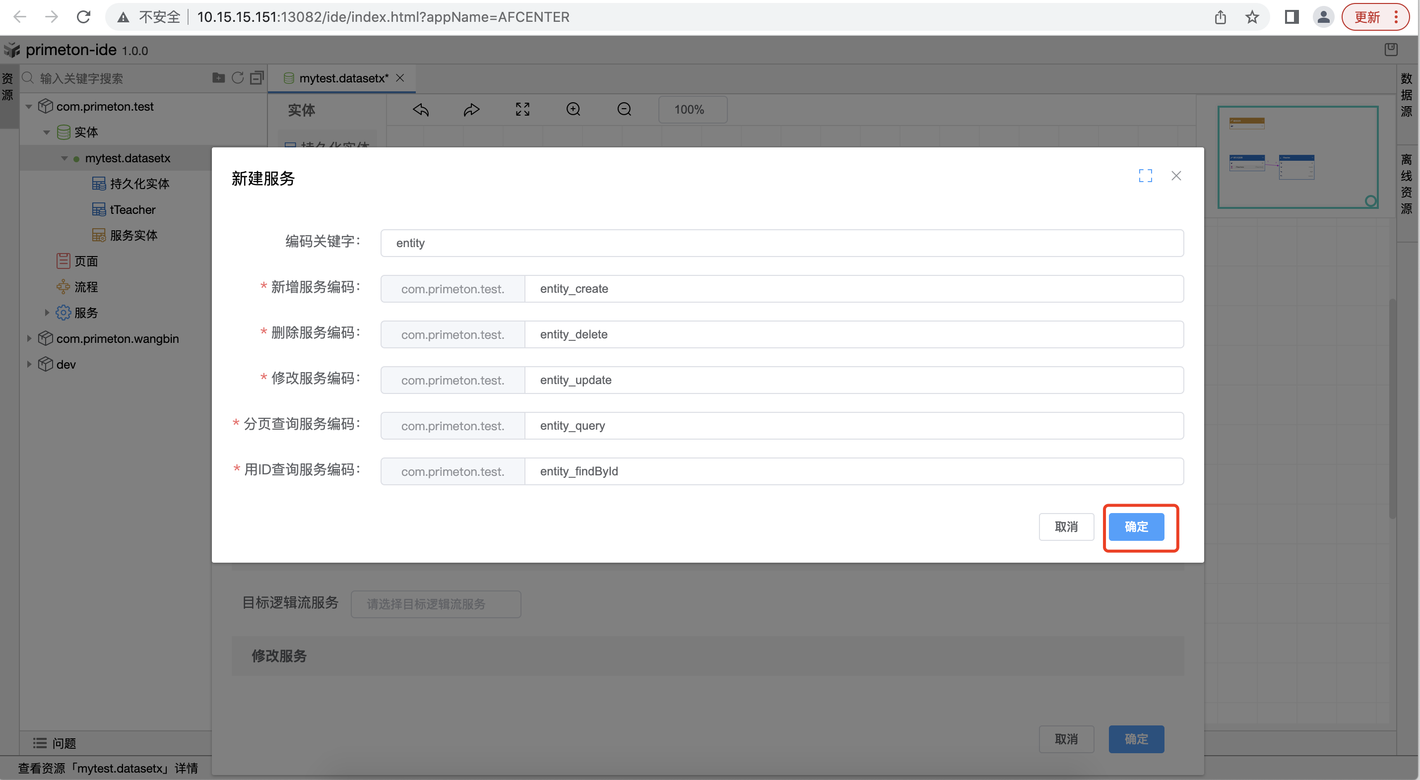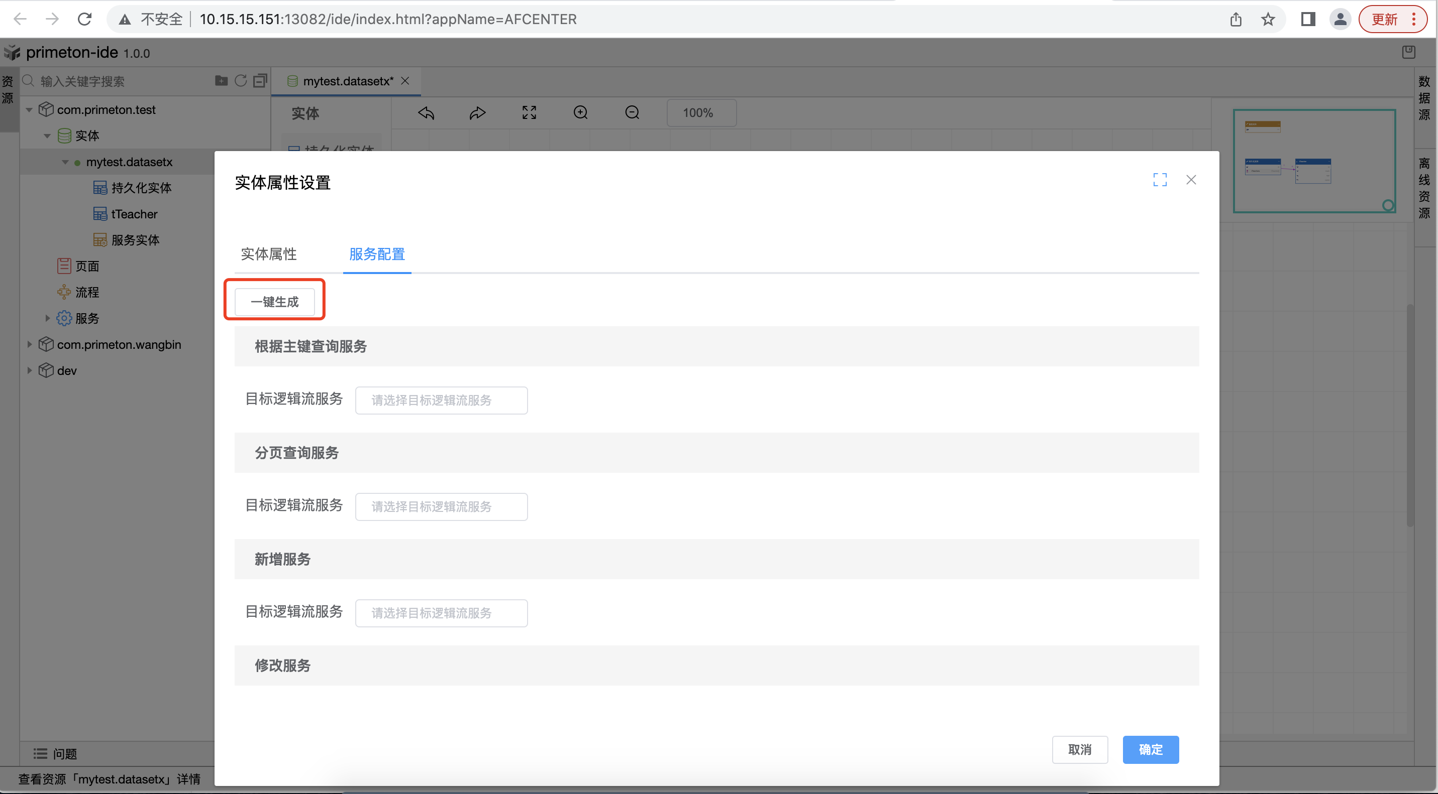 - 或者点击一键生成按钮,弹出自动生成的服务窗口,点击确定后完成绑定服务操作。