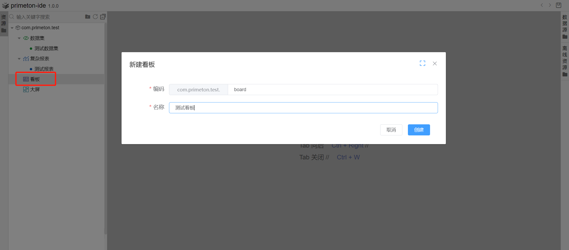 1. 选择构件包com.primeton.test的节点看板,右击创建看板,填写信息,点击创建。