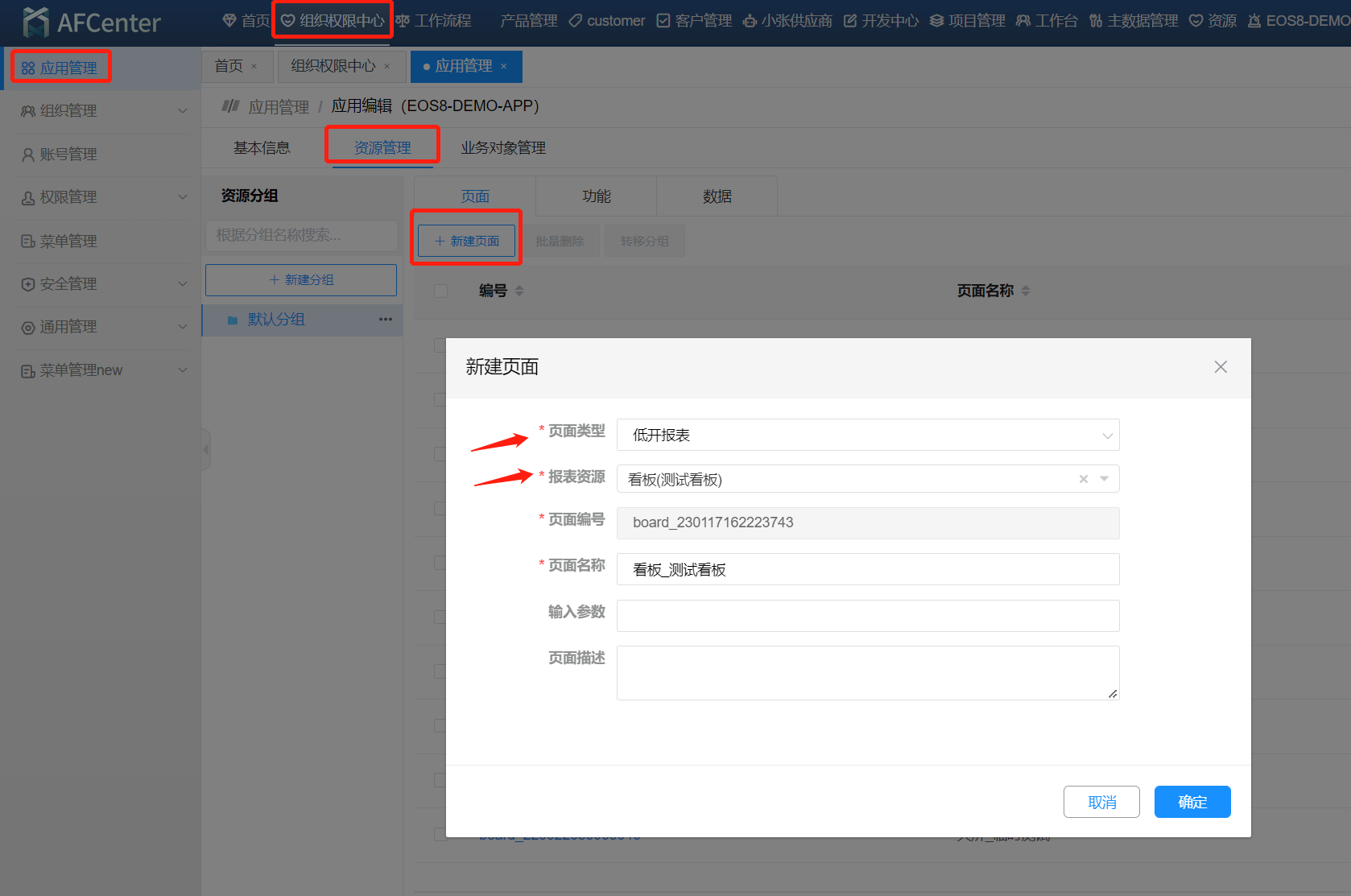 1. 在组织权限中心-应用管理界面中,选择EOS8-DEMO-APP应用,进入资源管理界面,点击新建页面。在新建页面的弹出框中,选择页面类型为低开报表,选择测试看板资源,编辑其他信息,点击确定。