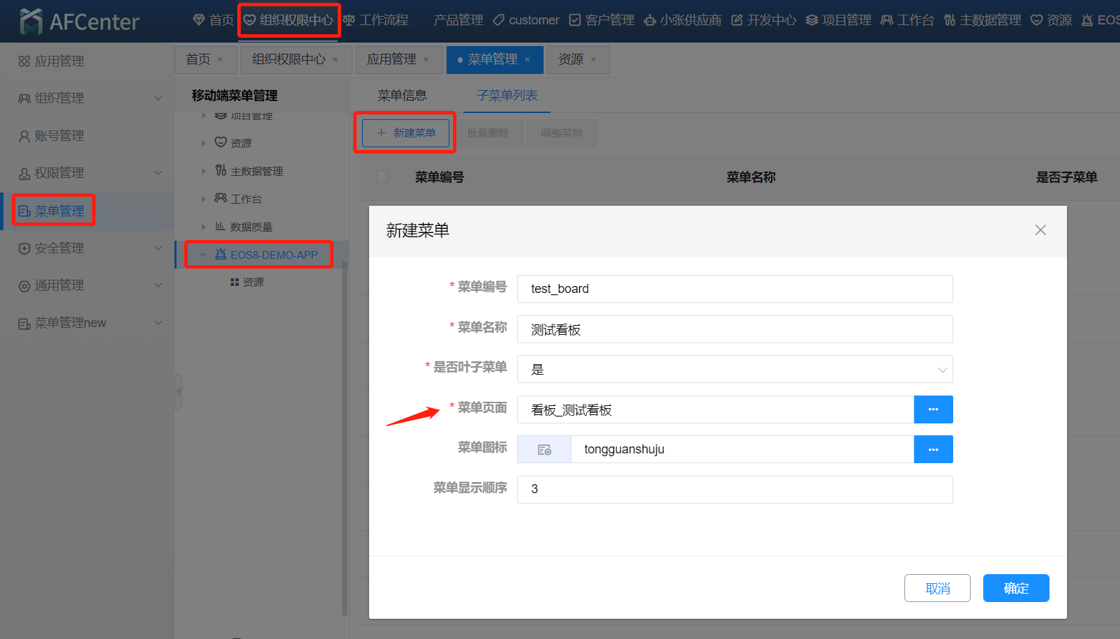 2. 在组织权限中心-菜单管理界面中,选择菜单树上的EOS8-DEMO-APP菜单,进入子菜单管理界面,点击新建菜单。在新建菜单的弹出框中,菜单页面选择测试看板,编辑其他信息,点击确定。