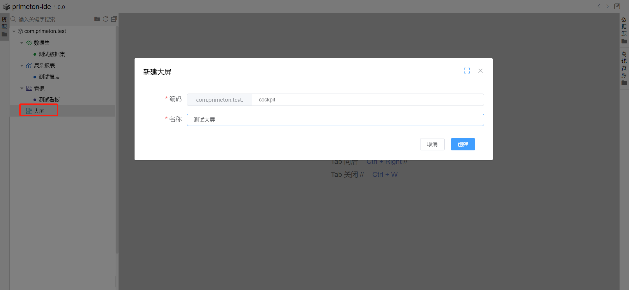 1. 选择构件包com.primeton.test的节点大屏,右击创建大屏,填写信息,点击创建。