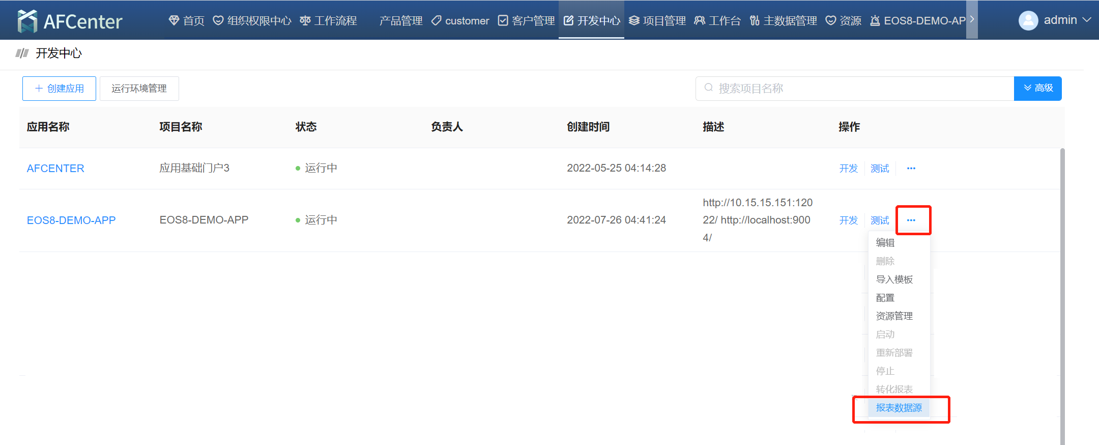 1. 在开发中心,选择EOS8-DEMO-APP,点击进入报表数据源界面。