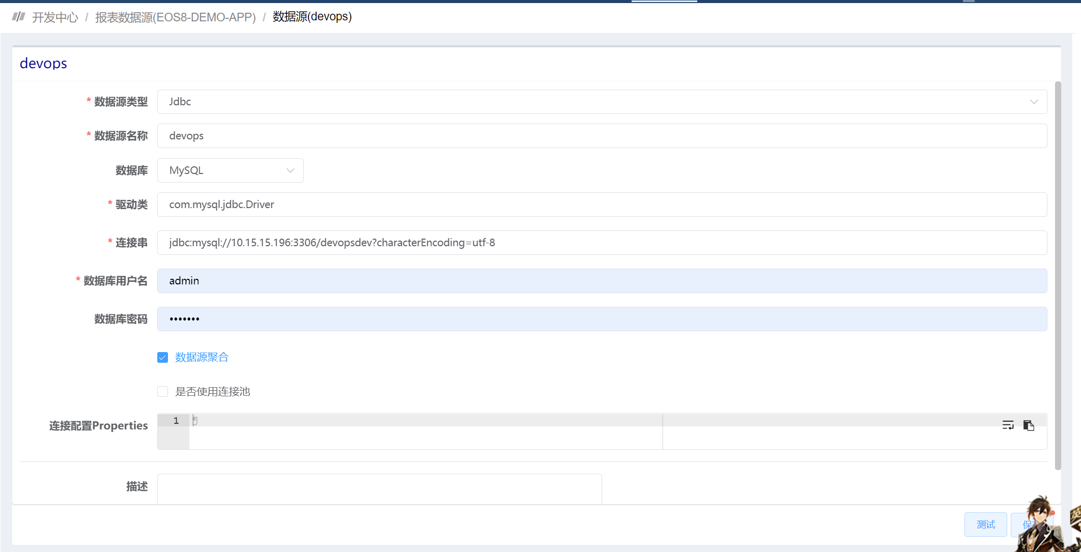 2. 在新建的测试数据集中,选择数据源devops,填写其他相关信息,具体开发详解请参考iData开发手册。