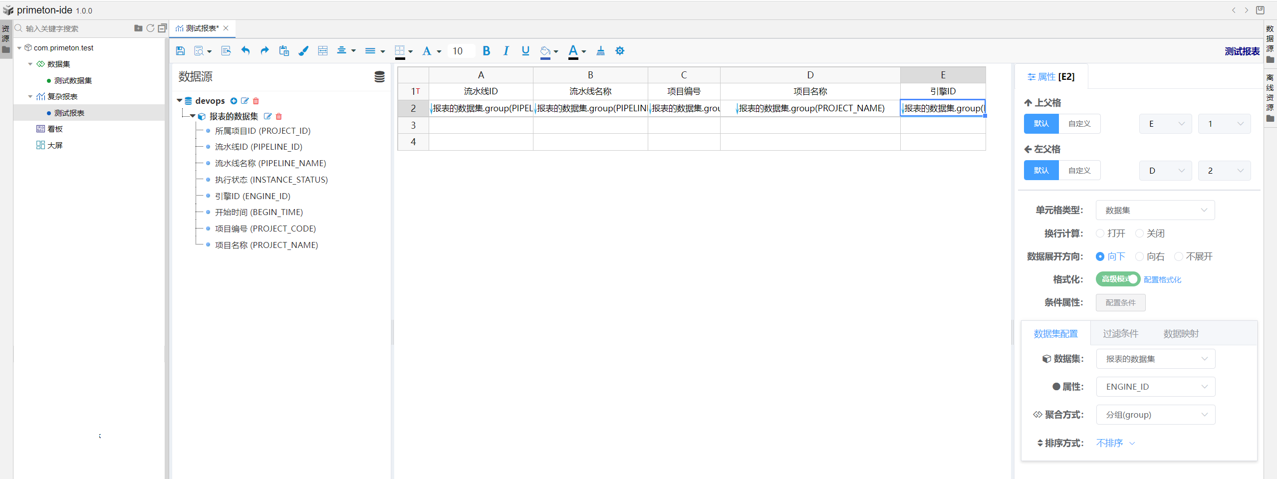2. 在新建的测试报表中,选择数据源devops,填写其他相关信息,具体开发详解请参考iData开发手册。