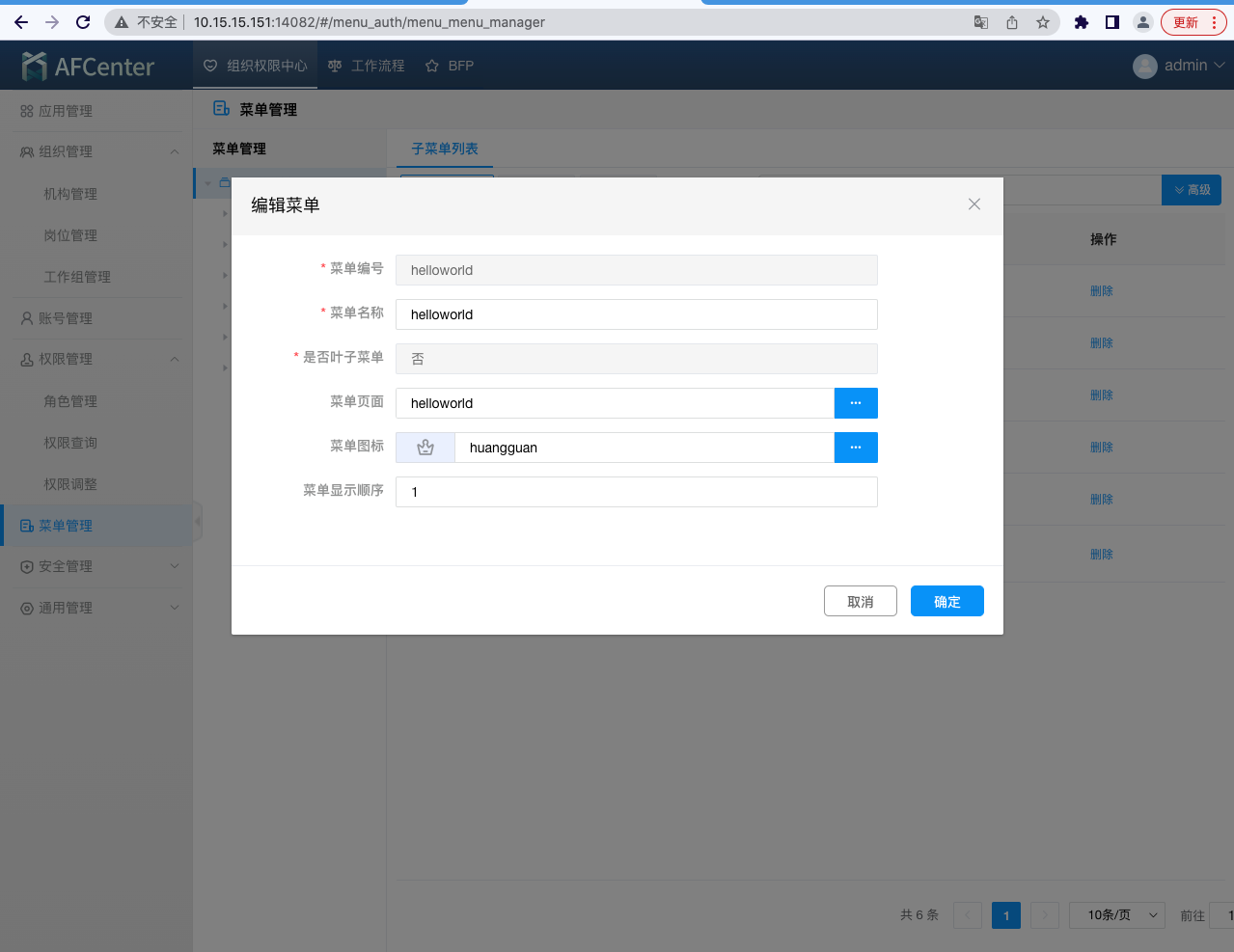 使用admin账号进入AFCenter 应用管理菜单->创建应用。