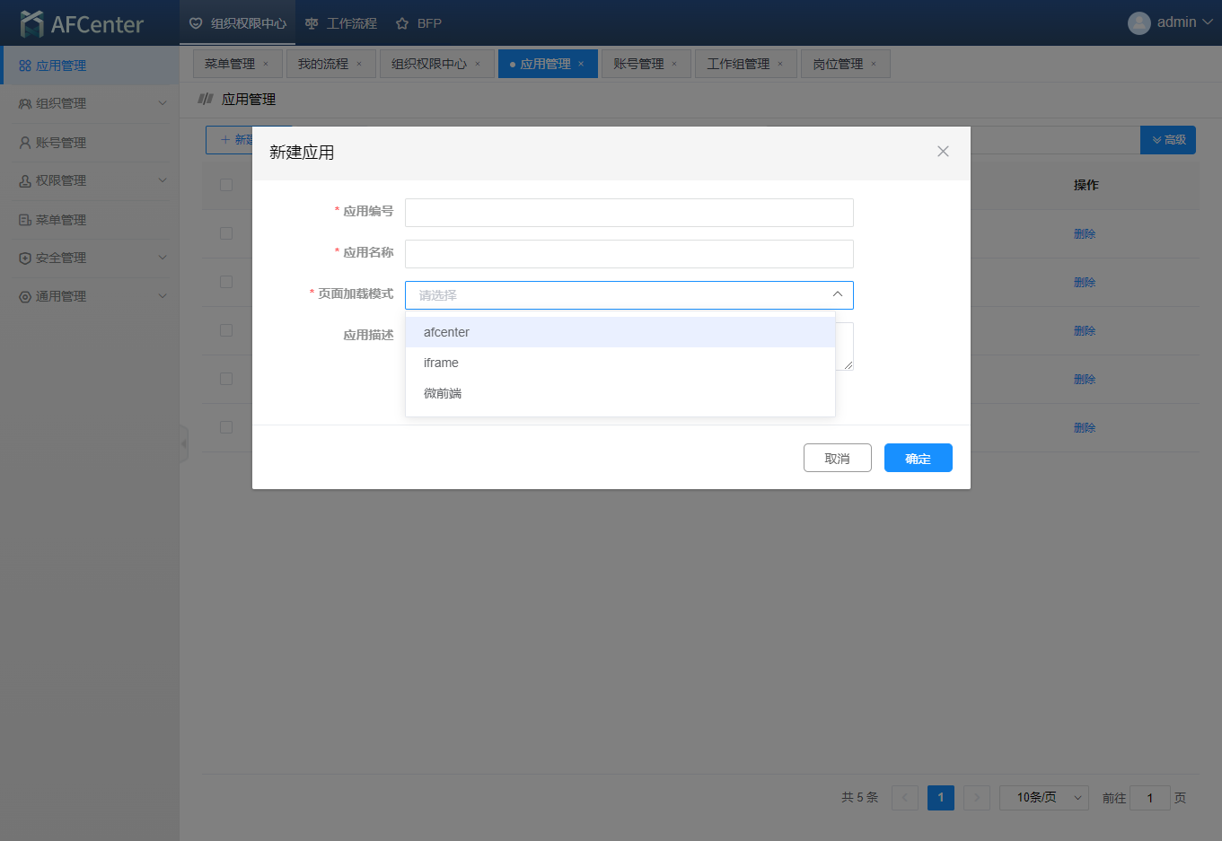 其中页面路径为afcenter源码项目中base\src\views 下需要添加页面资源的相对路径。注意:地址连接用的是 '/' 例如: 需要添加的页面在afcenter源码中的位置为base\src\views\afcenter\app\index.vue 那么页面路径为afcenter/app/index