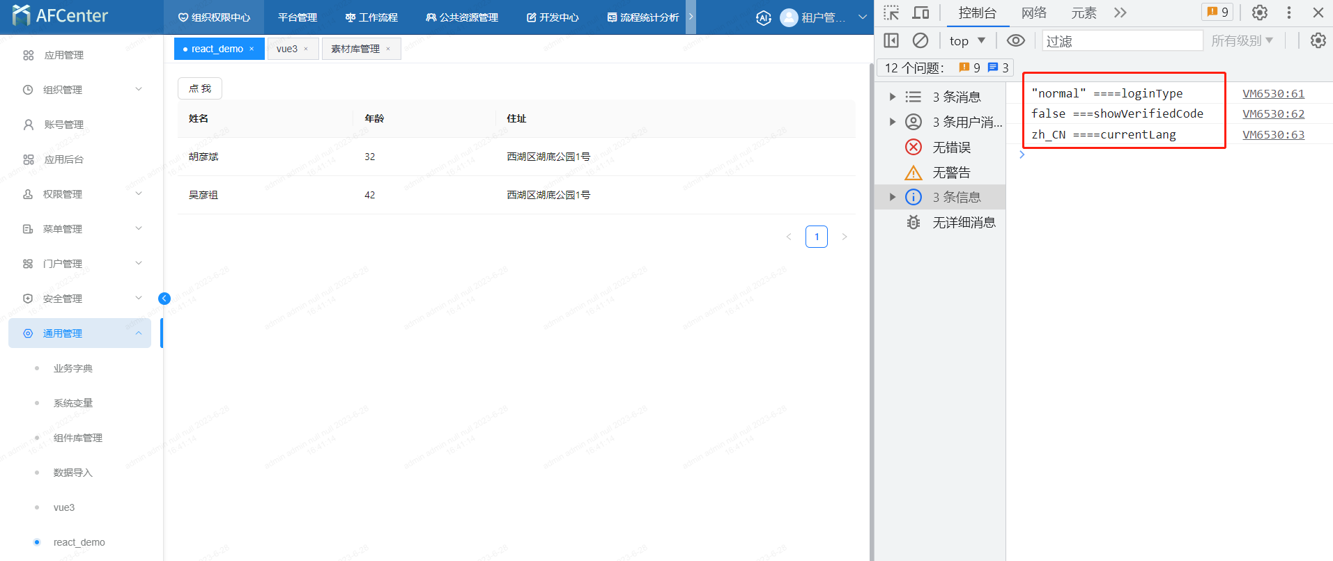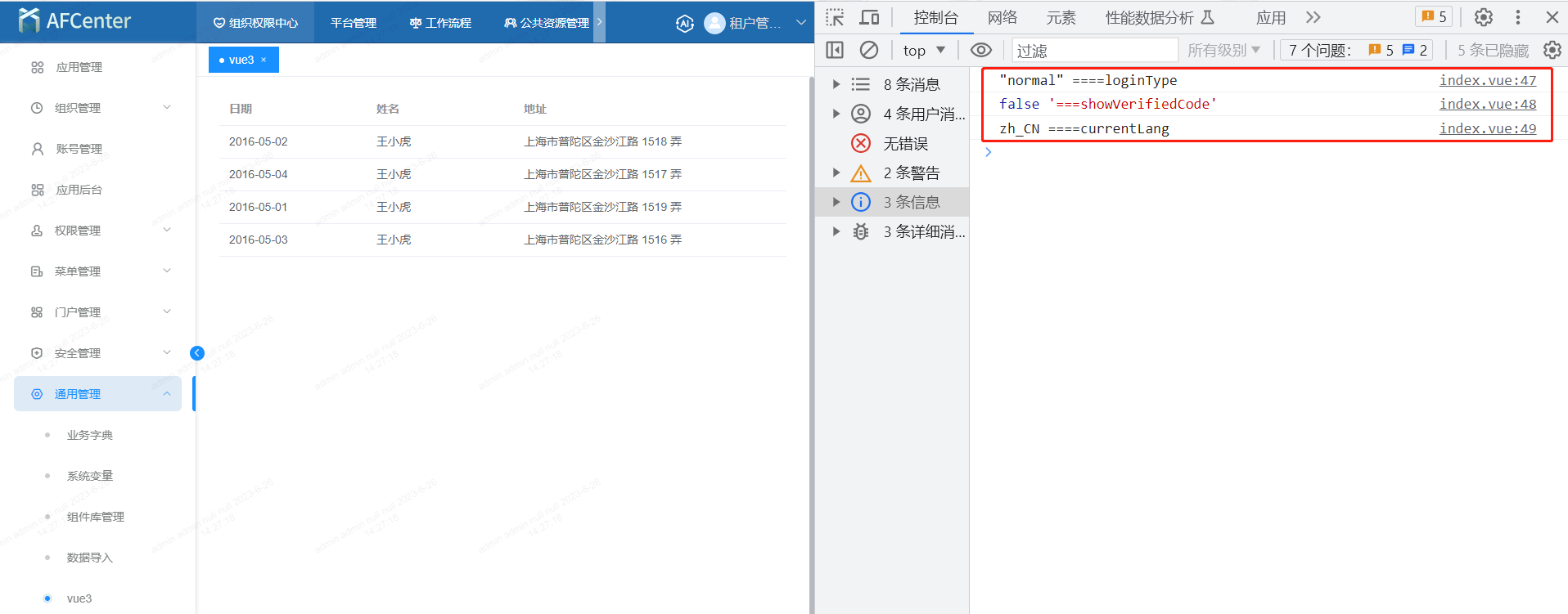 // 本地存储 console.log(localStorage.getItem('loginType'), '====loginType') // 会话存储,使用插件store,参考src\views\demo\index.vue页面引入的store console.log(store.get('showVerifiedCode'),'===showVerifiedCode') // 使用插件js-cookie,具体参考src\views\demo\index.vue console.log(Cookies.get('language') || 'zh_CN', '====currentLang' )![]()