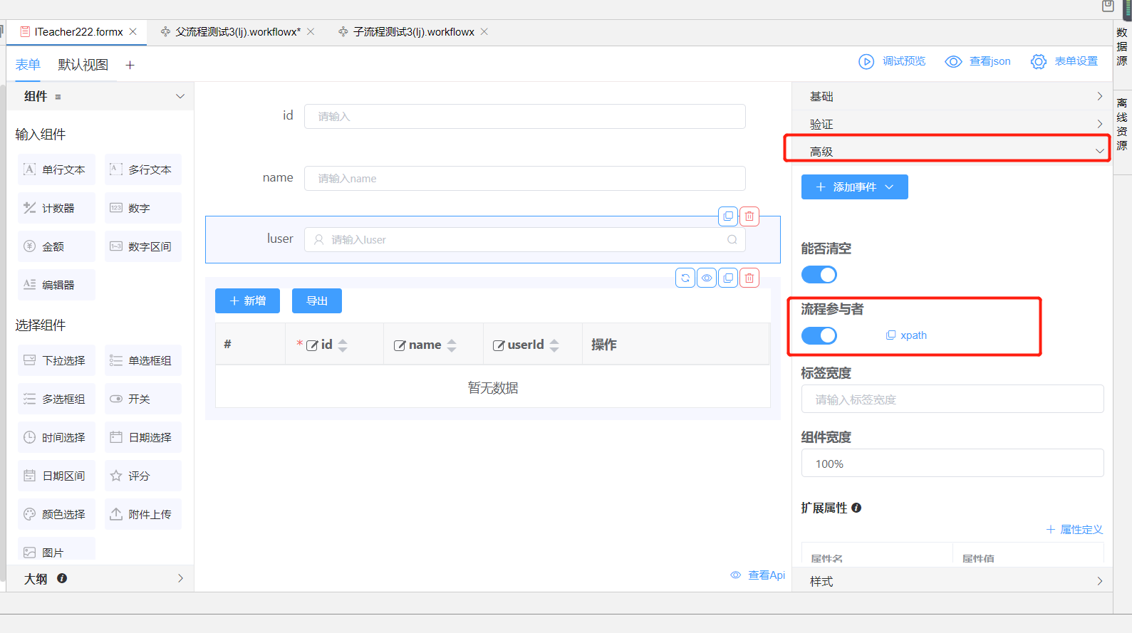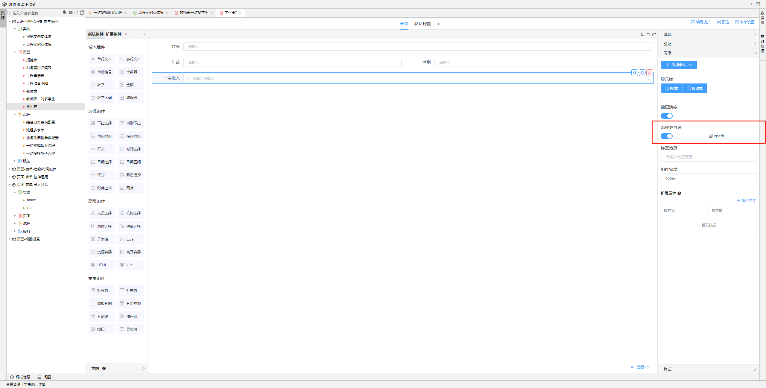 2.根据数据实体创建子流程表单页面,n端作为子流程页面,具备可以自定义选择参与者功能,需要拖动一个人员选择组件,绑定审批人字段,打开高级选项,开启流程参与者按钮。