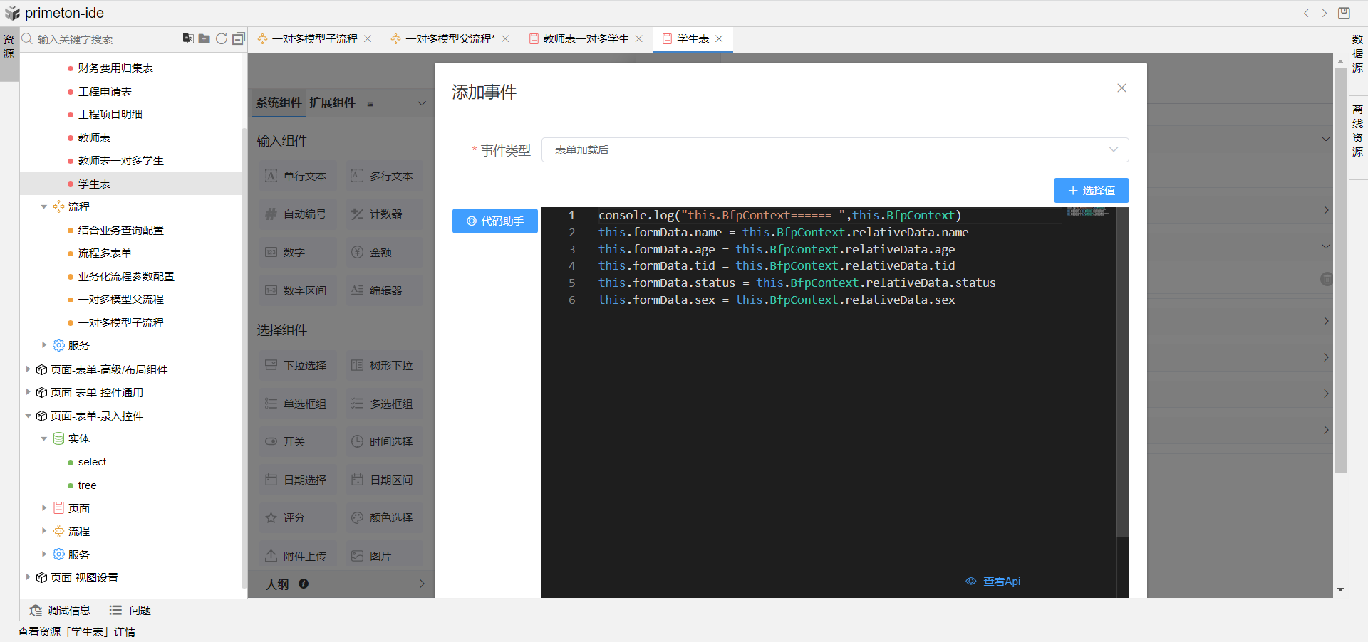 8.在n端表单的中,创建表达按加载后事件,将父流程传递过来放在前端相关数据区中的数据取出并为表单赋值。
