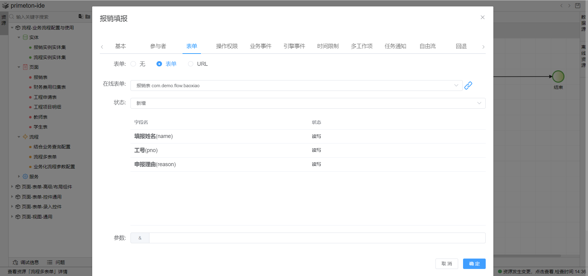 1.创建流程时绑定流程启动表单,拖动右侧图元构建流程图,双击第一个人工图元报销填报(即发起环节),打开图元属性修改弹窗,选择表单tab页,点击在线表单下拉框选择报销表单,选择表单状态为新增,点击确定关闭弹窗完成报销发起环节表单配置。