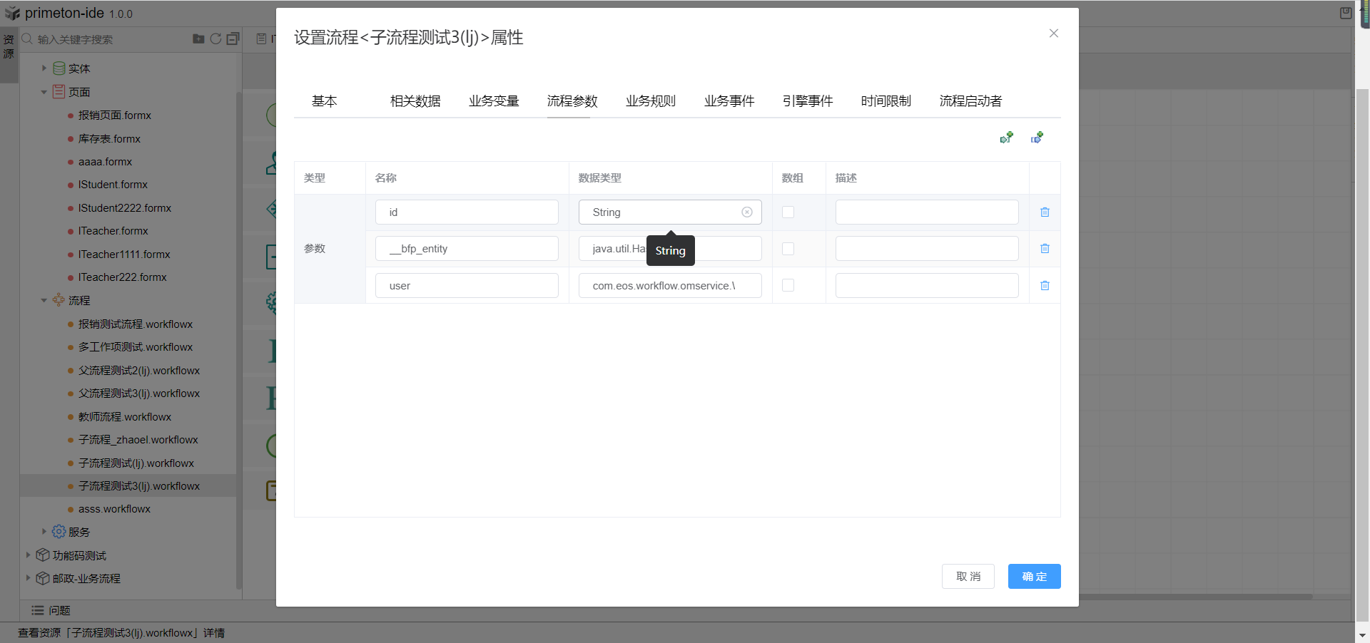 2.创建子流程,双击流程页面空白处,打开属性设置,点击流程参数tab页,设置流程参数