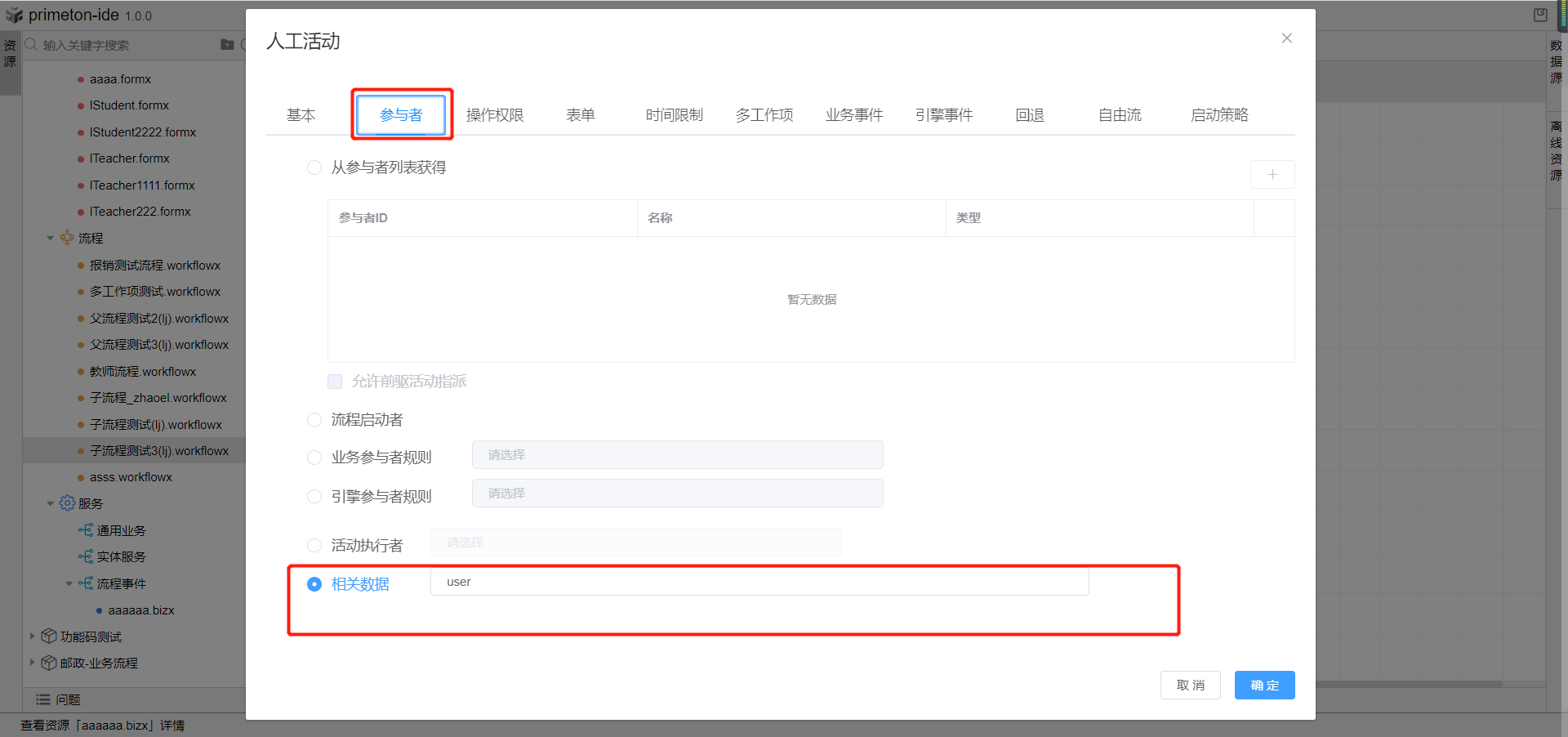 双击打开流程发起环节人工活动,点击参与者tab页,选择相关数据选项,输入流程参数user作为发起环节参与者。点击确认,保存流程即完成子流程配置。