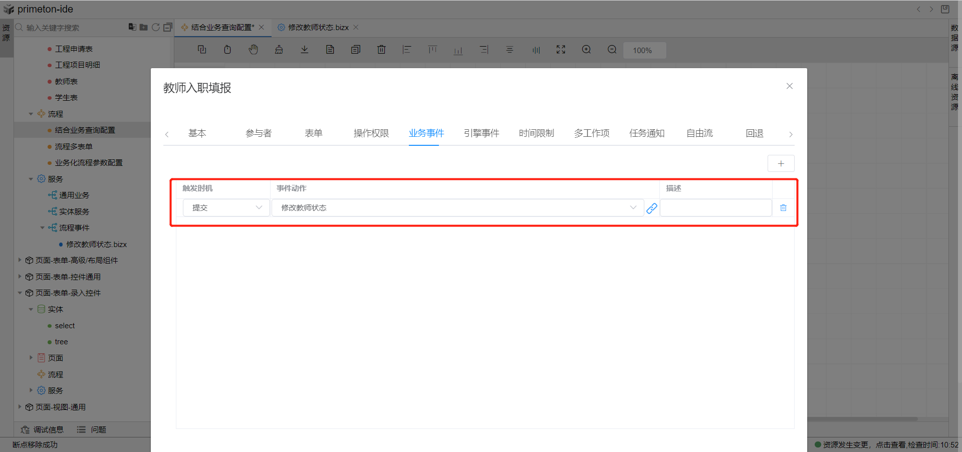 4.回到流程节点中去,在教师入职填报与教师入职信息审核节点分别双击图元,选择业务事件tab页,新增业务事件,触发时机选择提交(提交:流程按钮事件,表示在提交流程时触发调用逻辑流的事件),事件动作绑定我们刚刚创建的逻辑流即可,保存后完成流程流转时修改表单业务状态场景配置。