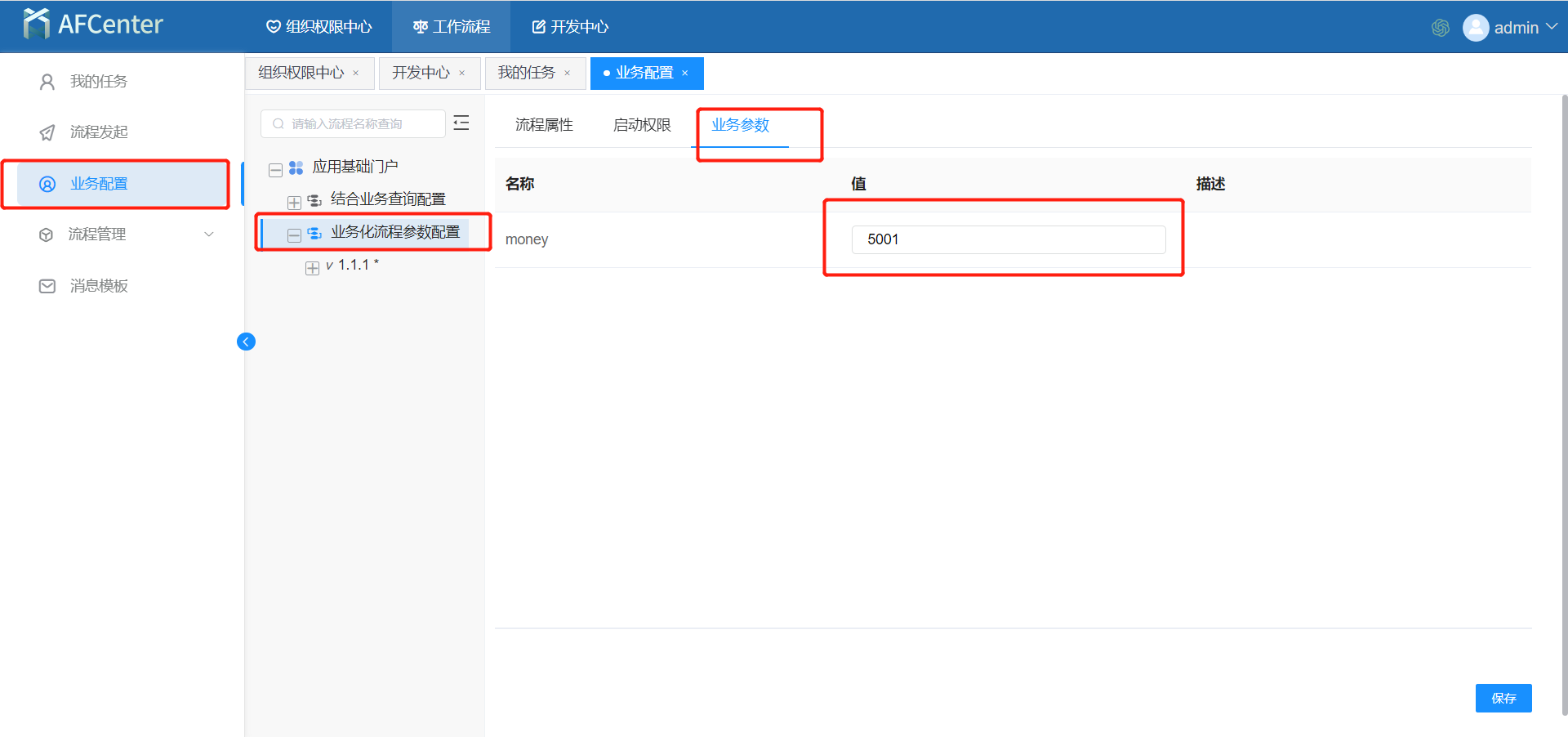 5.在流程中配置好后可以再AFCenter平台的工作流程配置中使用,根据业务动态修改业务参数的值。