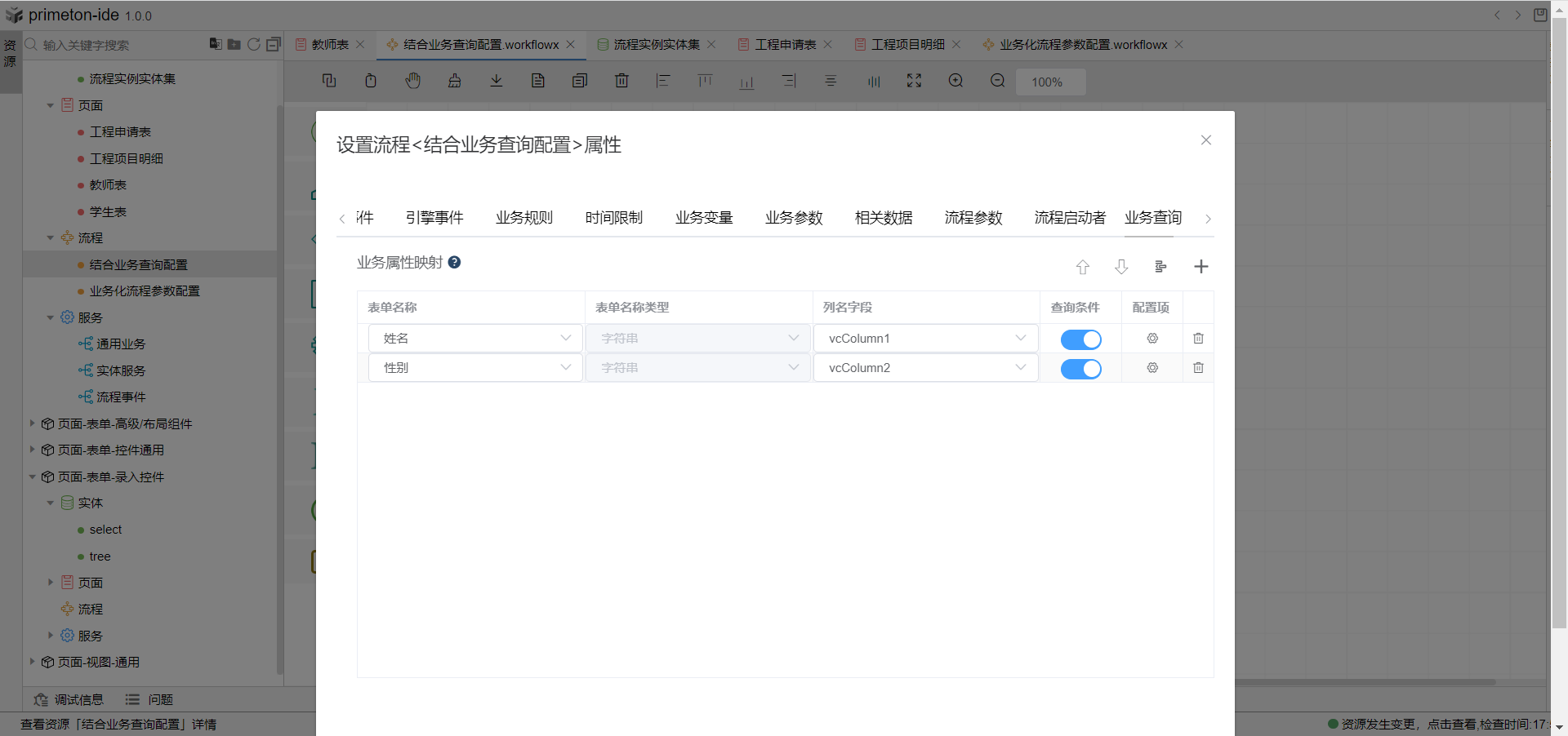 1.在创建好的业务流程中,双击空白面板,打开流程属性弹窗,选择最右边业务查询tab页。新增业务查询,选择好表单中的业务字段和对应的列名字段,打开查询条件开关。