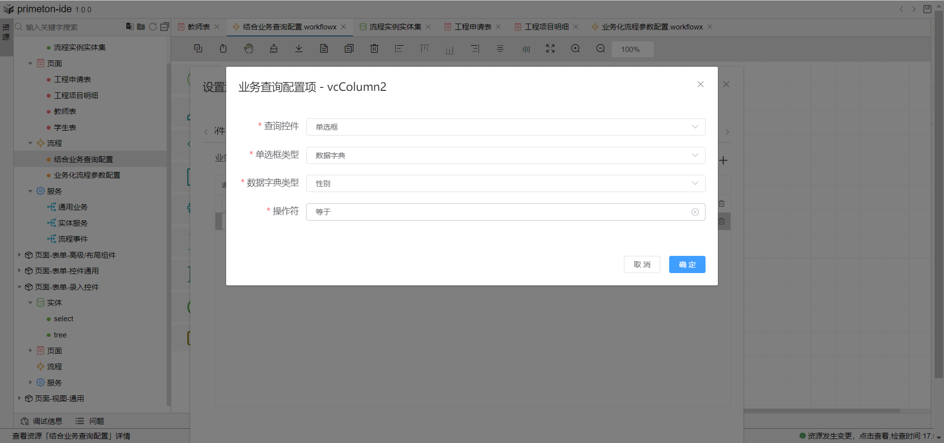 2.点击配置项图标,打开业务查询详细配置,绑定查询控件与操作符,如果查询控件选择单选框,可以绑定字典值,或者自定义选项值。配置完成后保存流程即可。