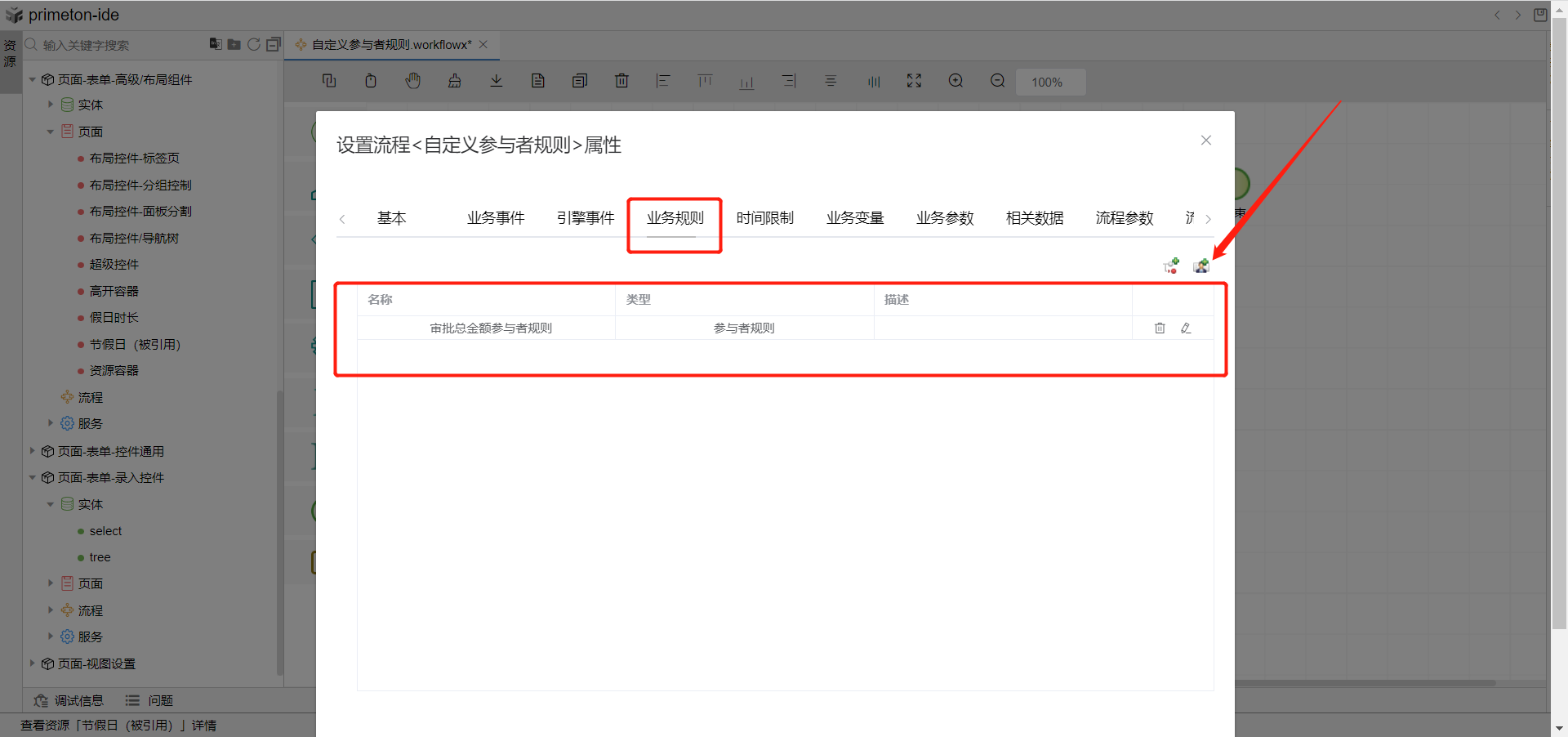 业务规则:可选择参与者规则类型,用于流程中人工活动获取参与者,规则需要可以返回一个可用的参与者