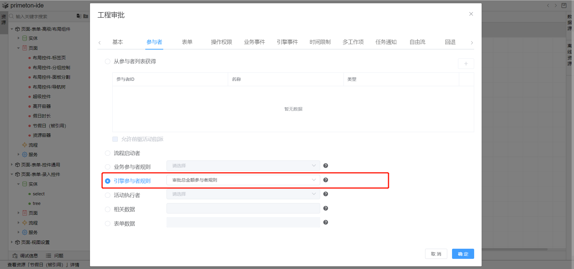 4.双击工程审批图元,选择参与者tab页,点击选择下方引擎参与者规则,绑定刚刚创建的参与者规则即可。