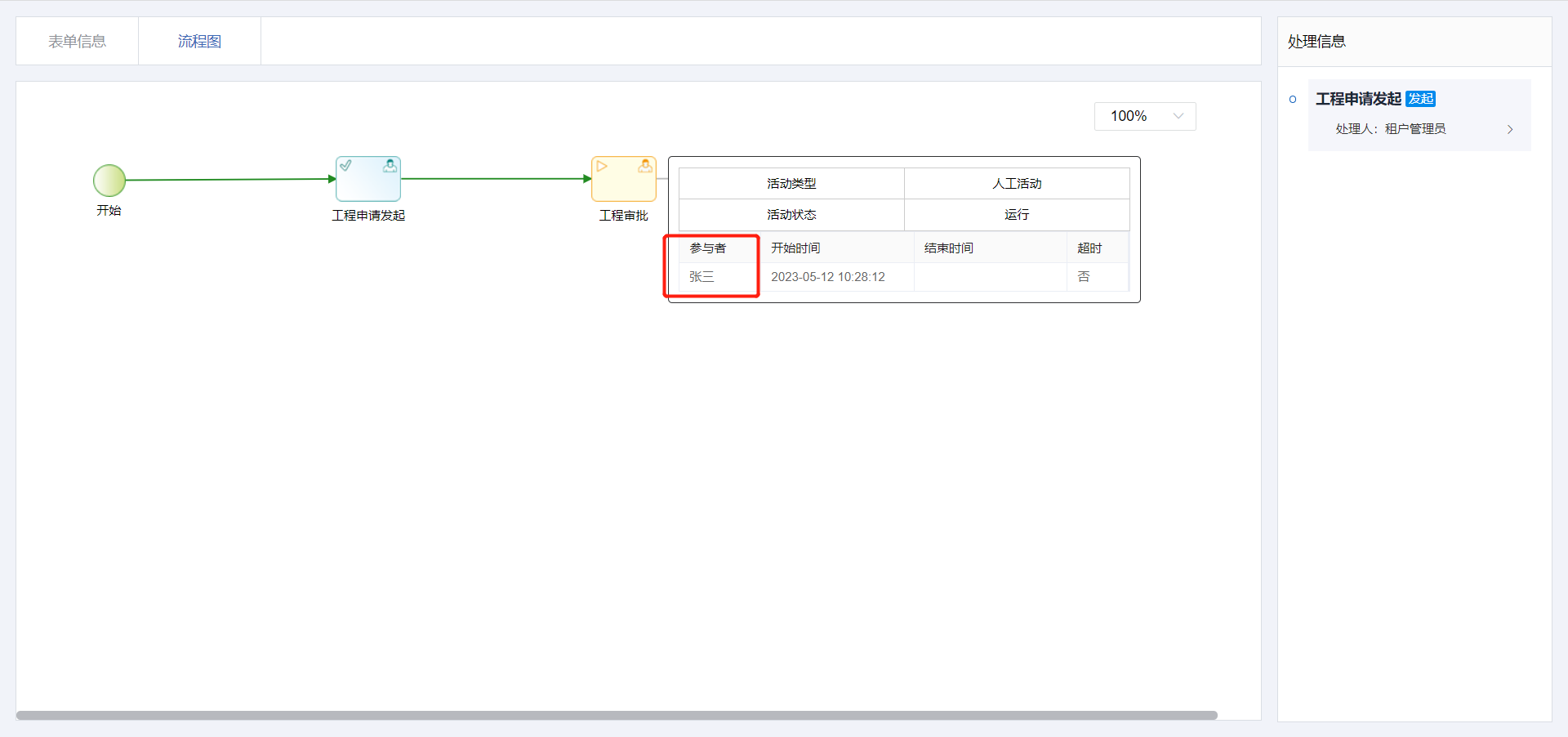 使用自定义参与者规则功能,在工程申请表单填写金额大于5000时交由具体人员张三审批,工程审批金额小于等于5000时交由租户管理员角色审批。