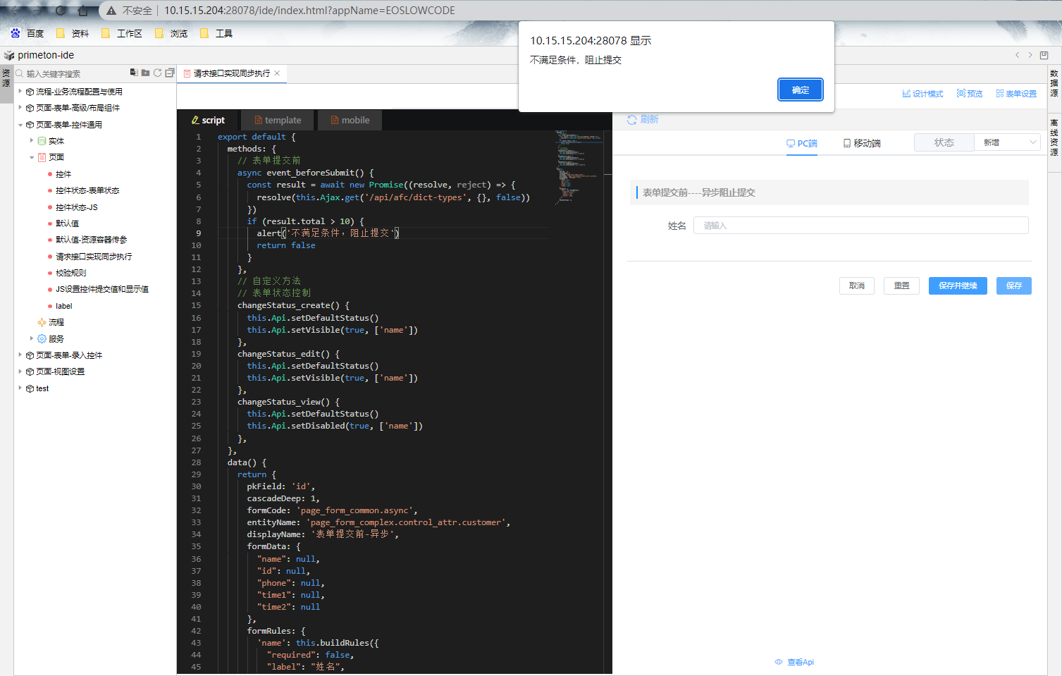 场景:表单提交前,调用接口,确认一下数据是否满足条件,不满足则不允许提交
