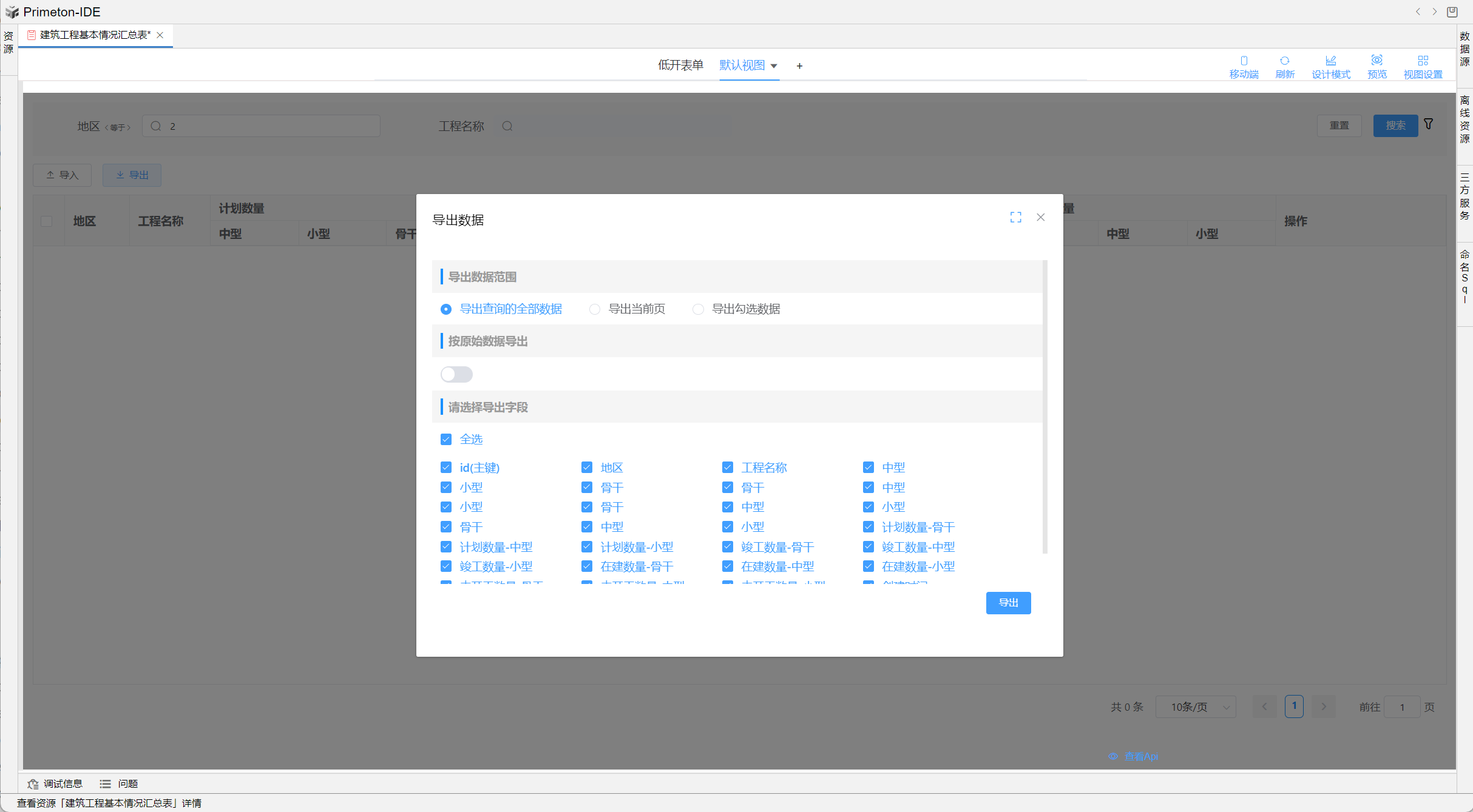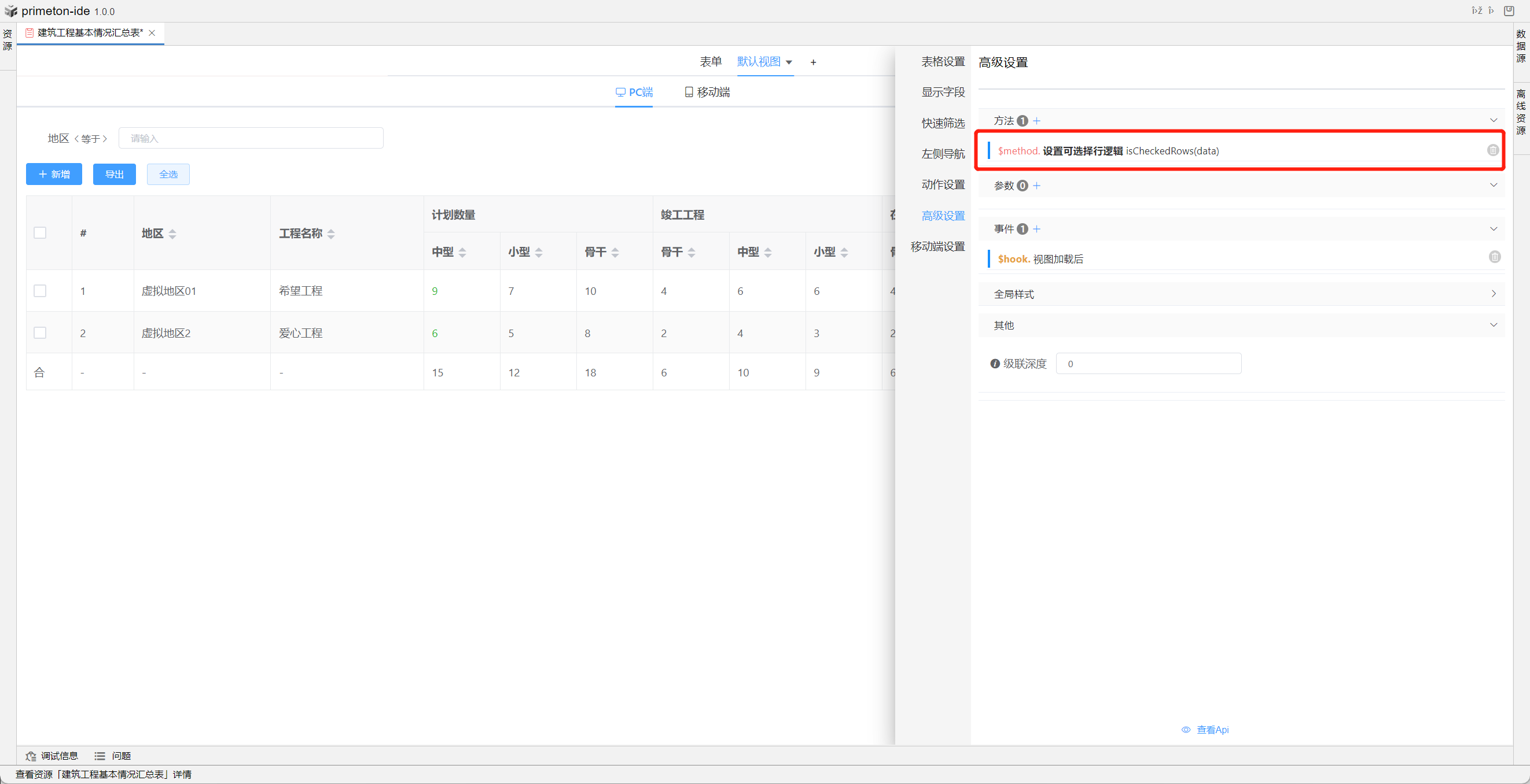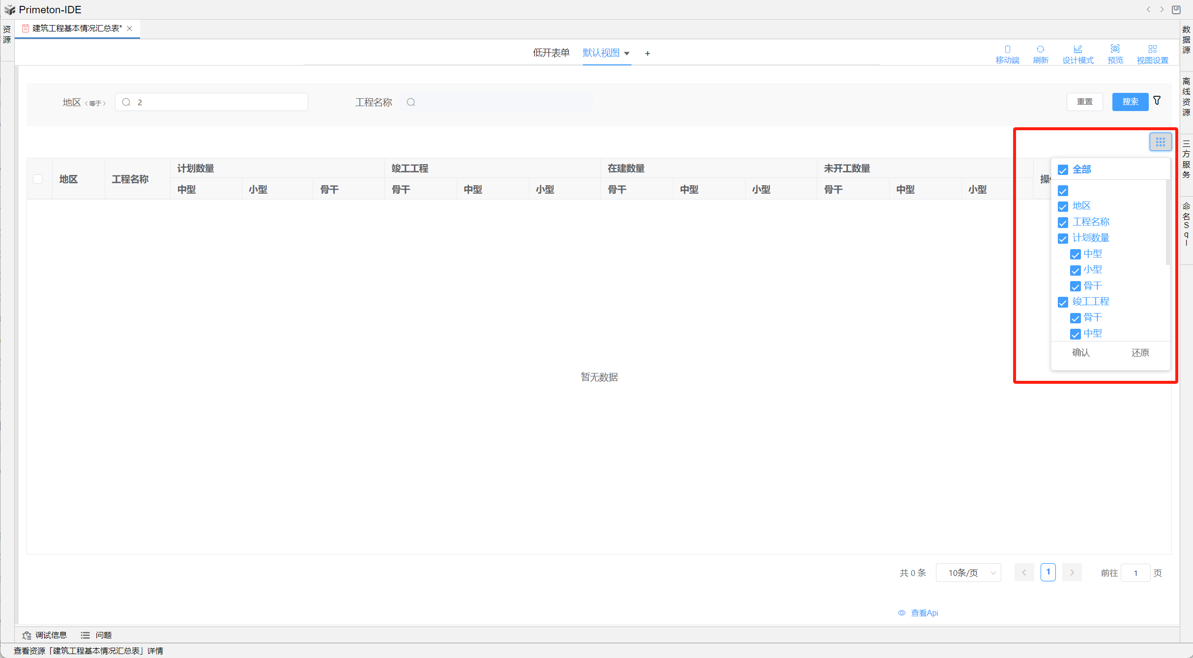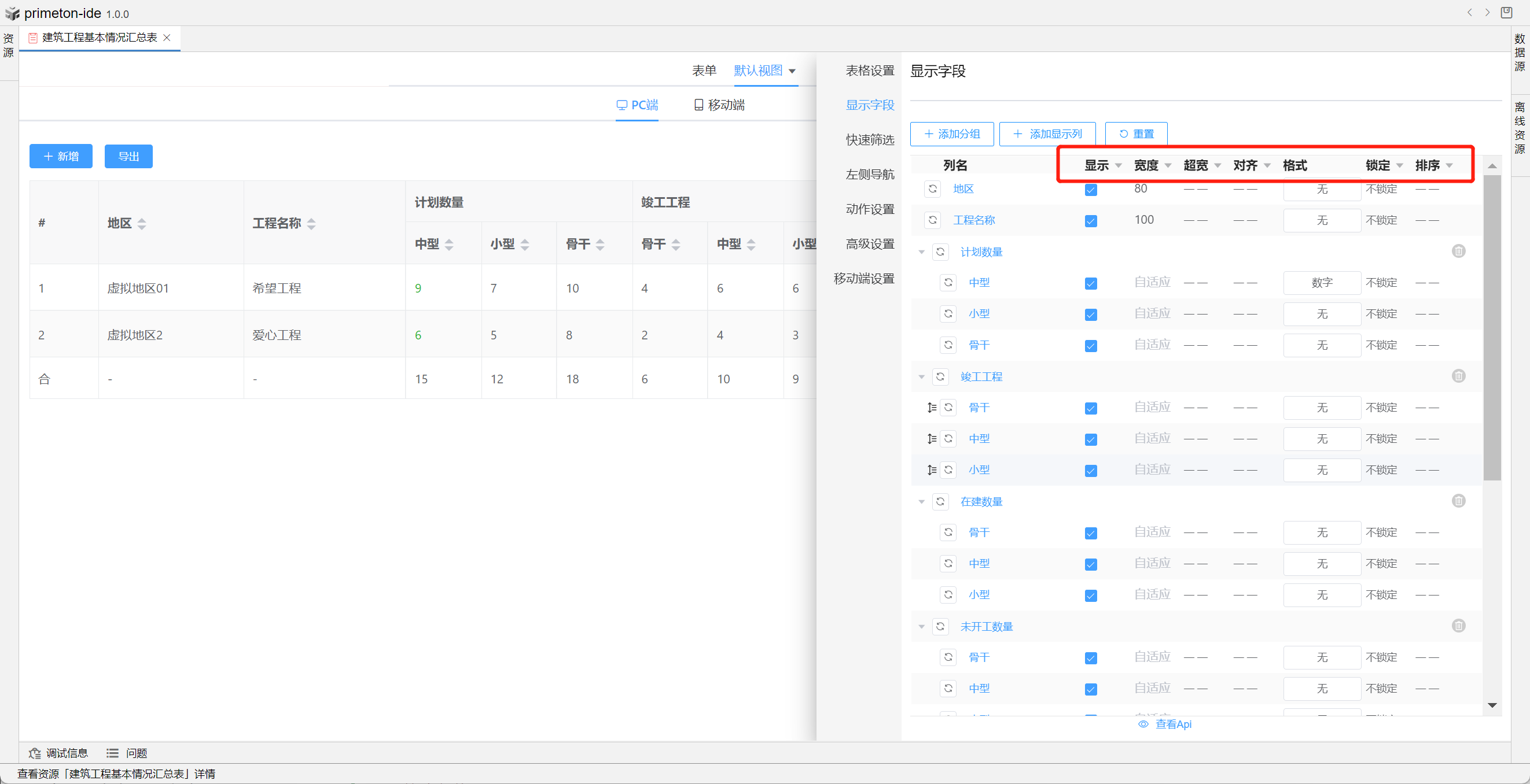 视图中table的格式可根据不同场景设置不同布局,本部分将以"建筑工程基本情况汇总表"为示例进行配置讲解