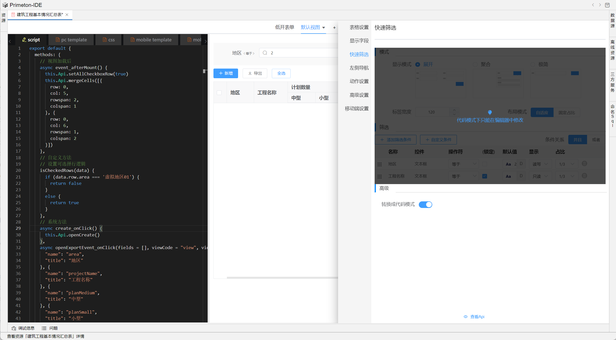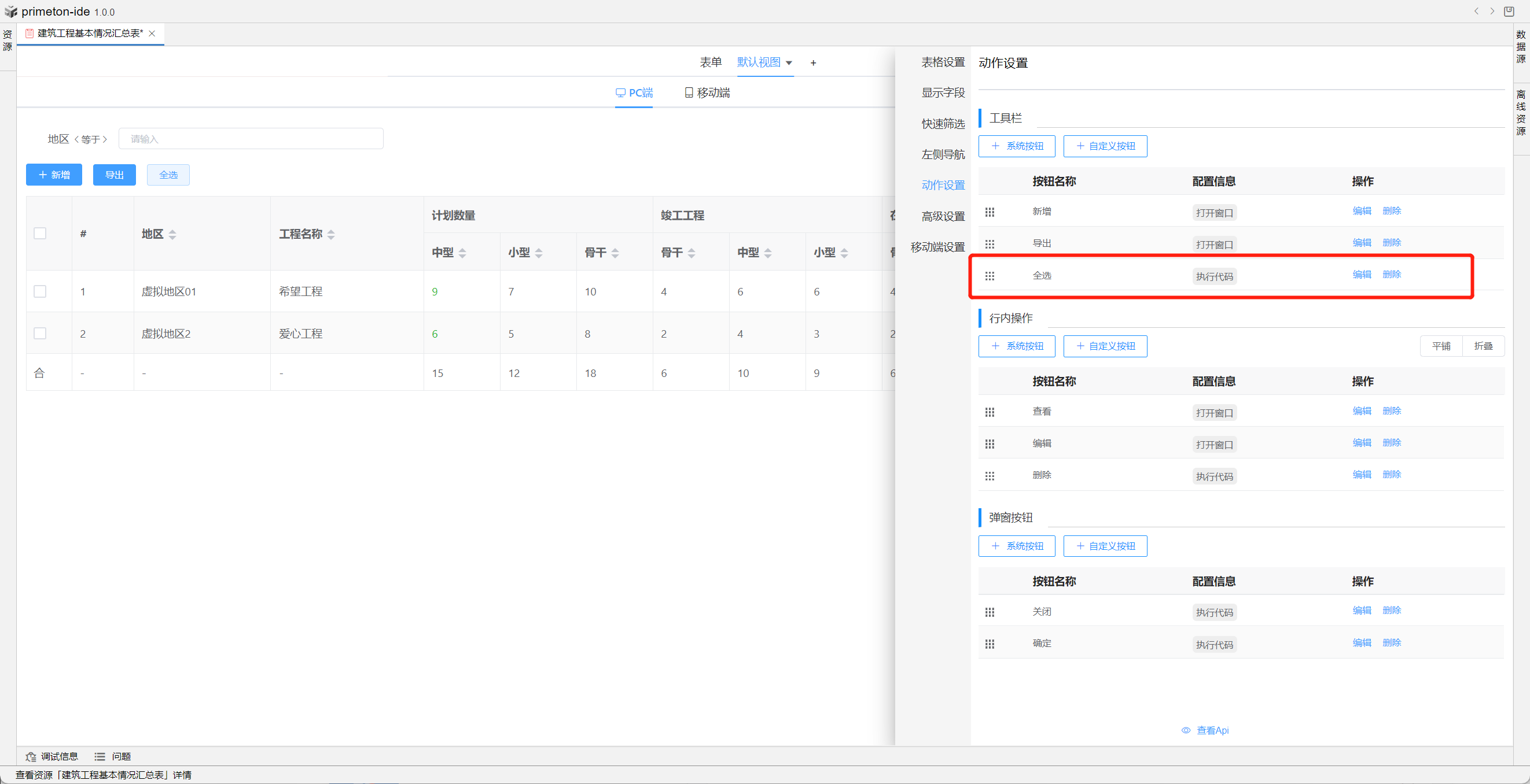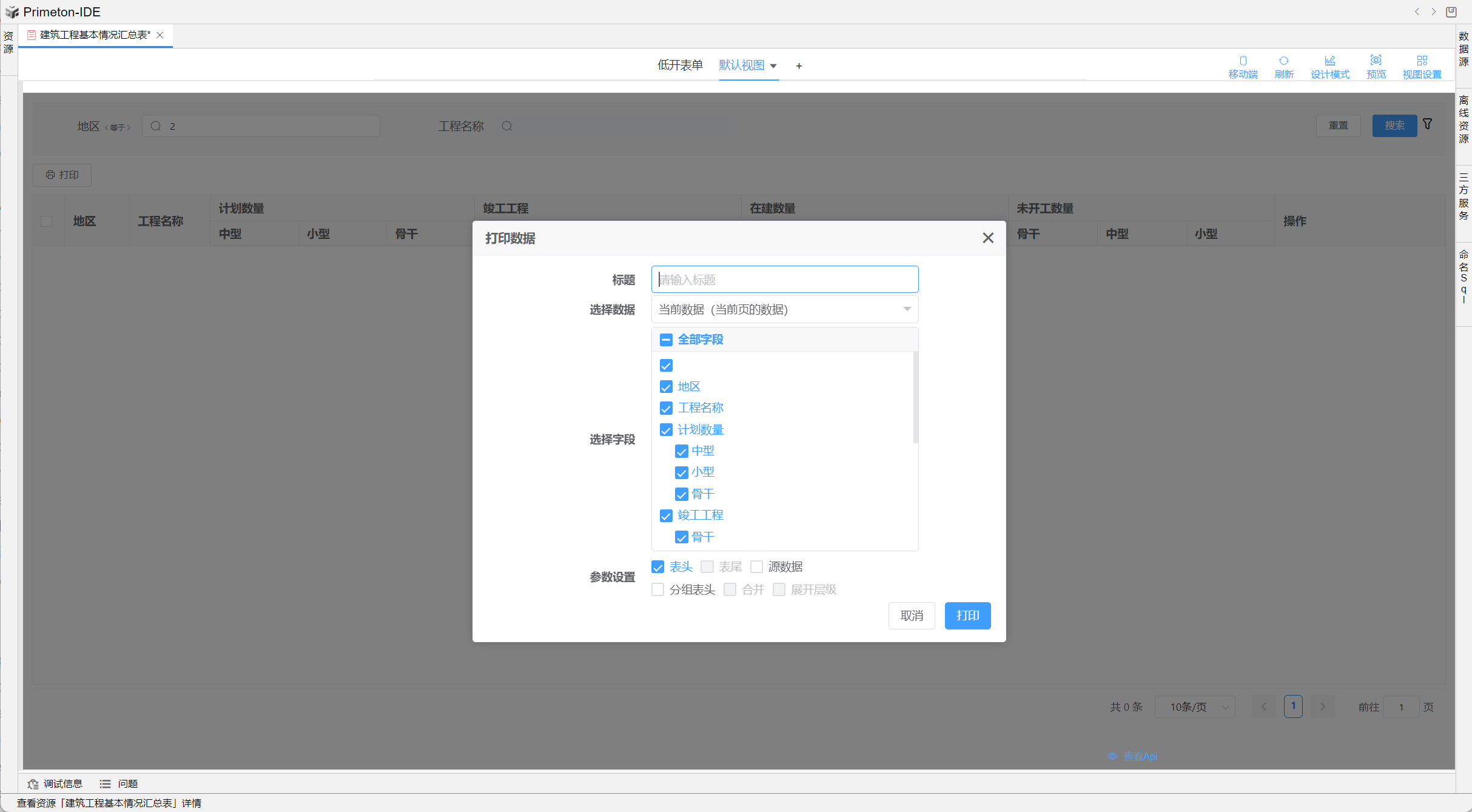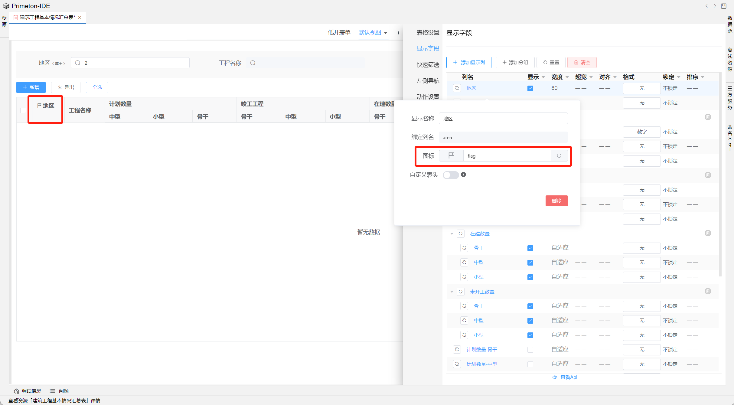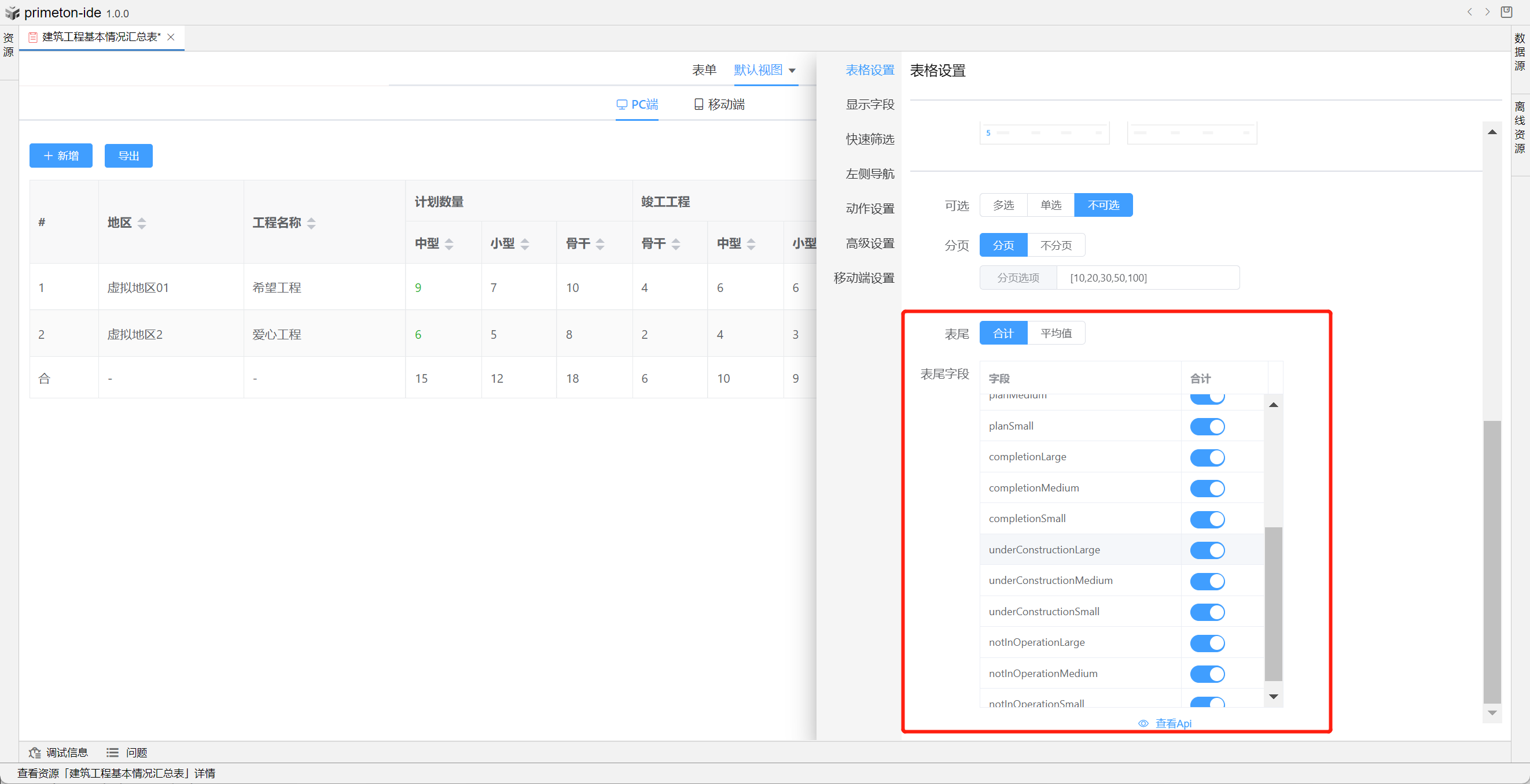视图中table的格式可根据不同场景设置不同布局,本部分将以"建筑工程基本情况汇总表"为示例进行配置讲解