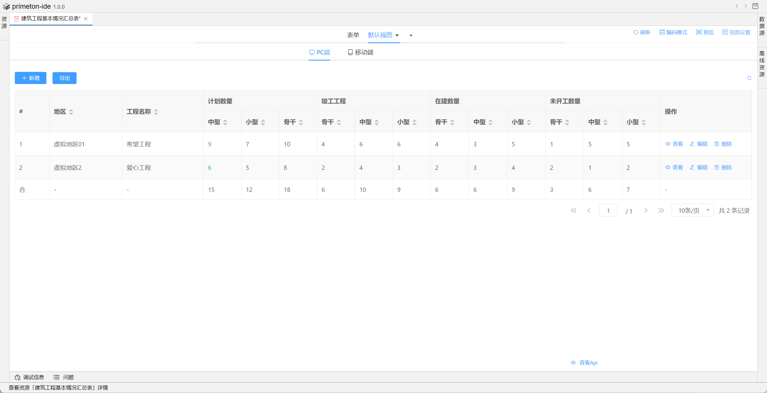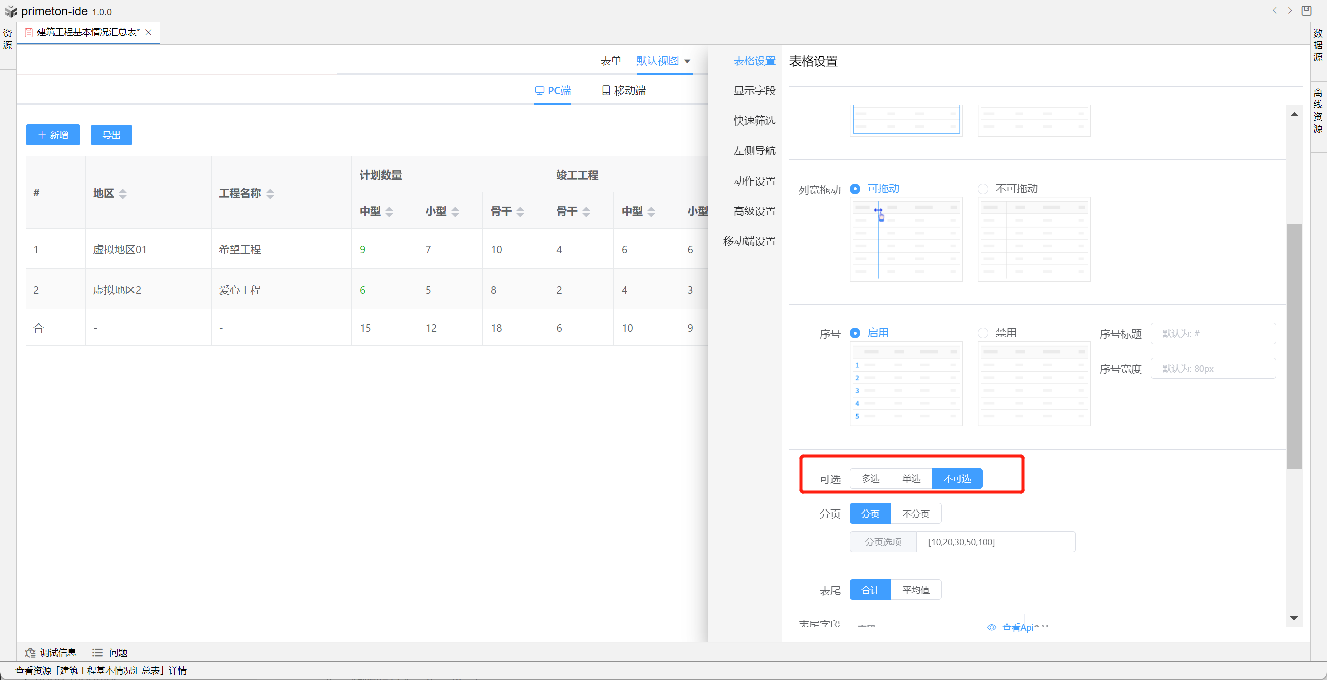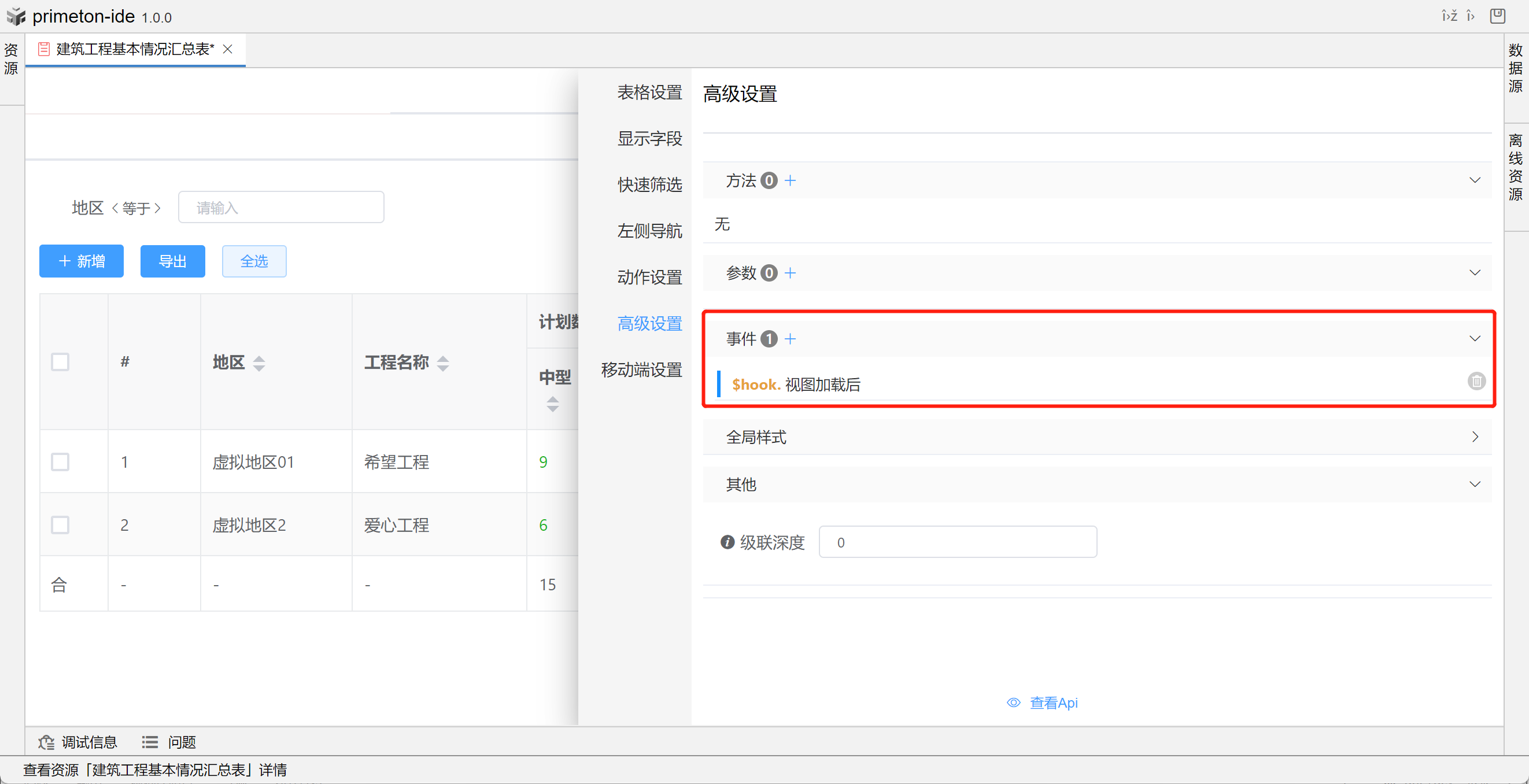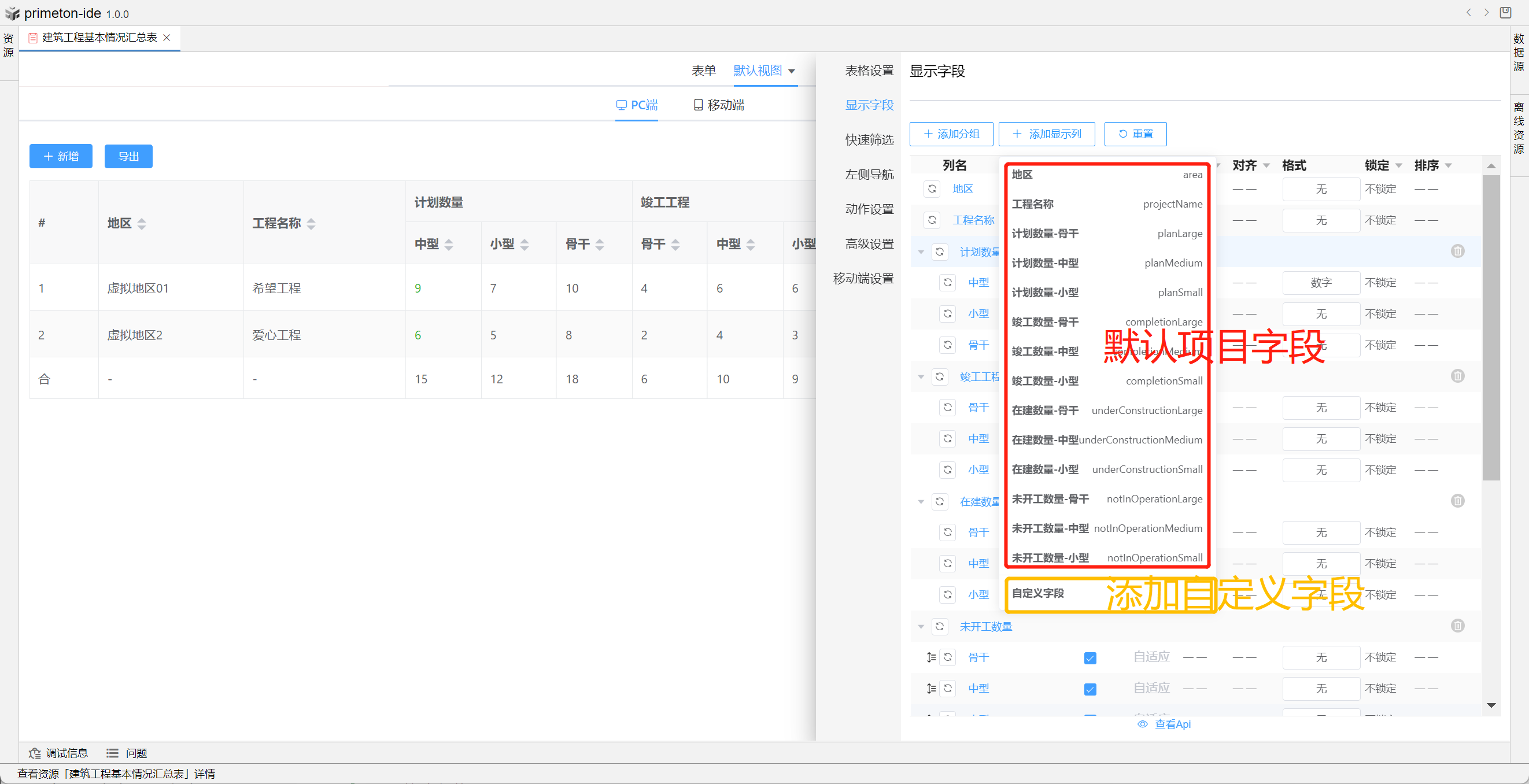 视图中table的格式可根据不同场景设置不同布局,本部分将以"建筑工程基本情况汇总表"为示例进行配置讲解