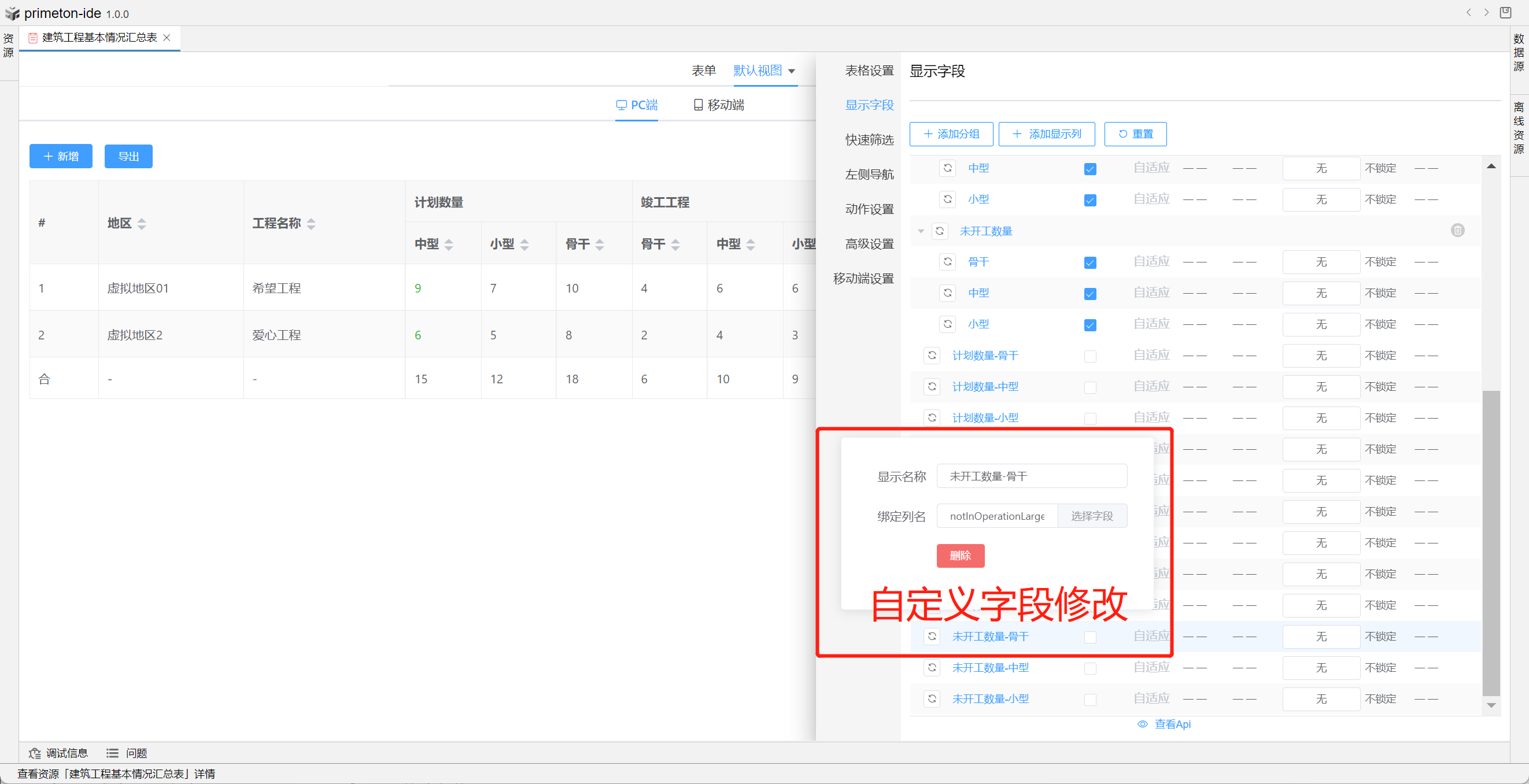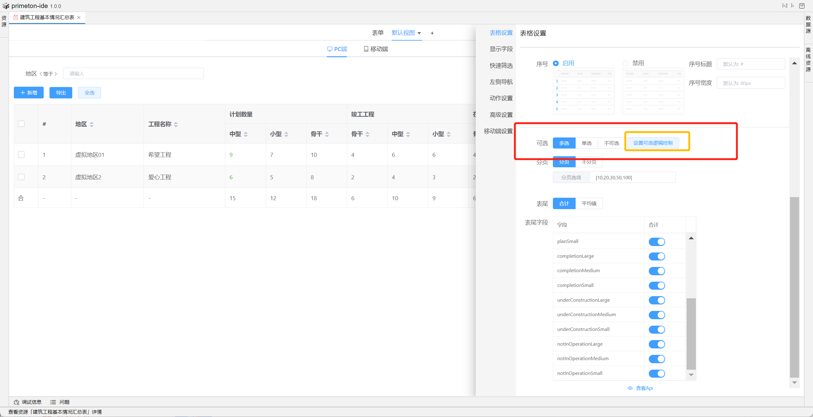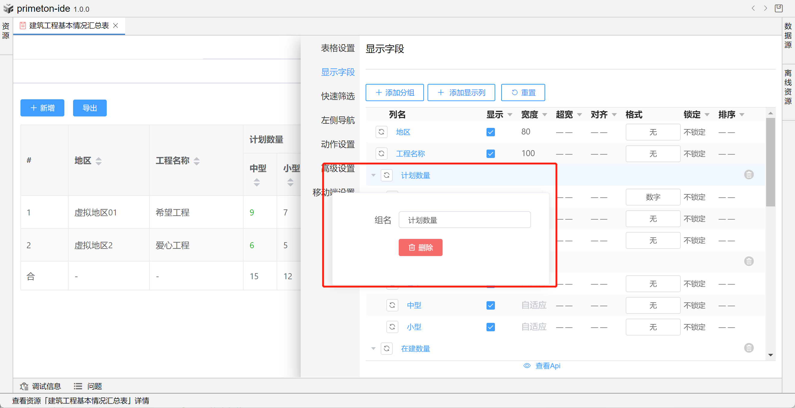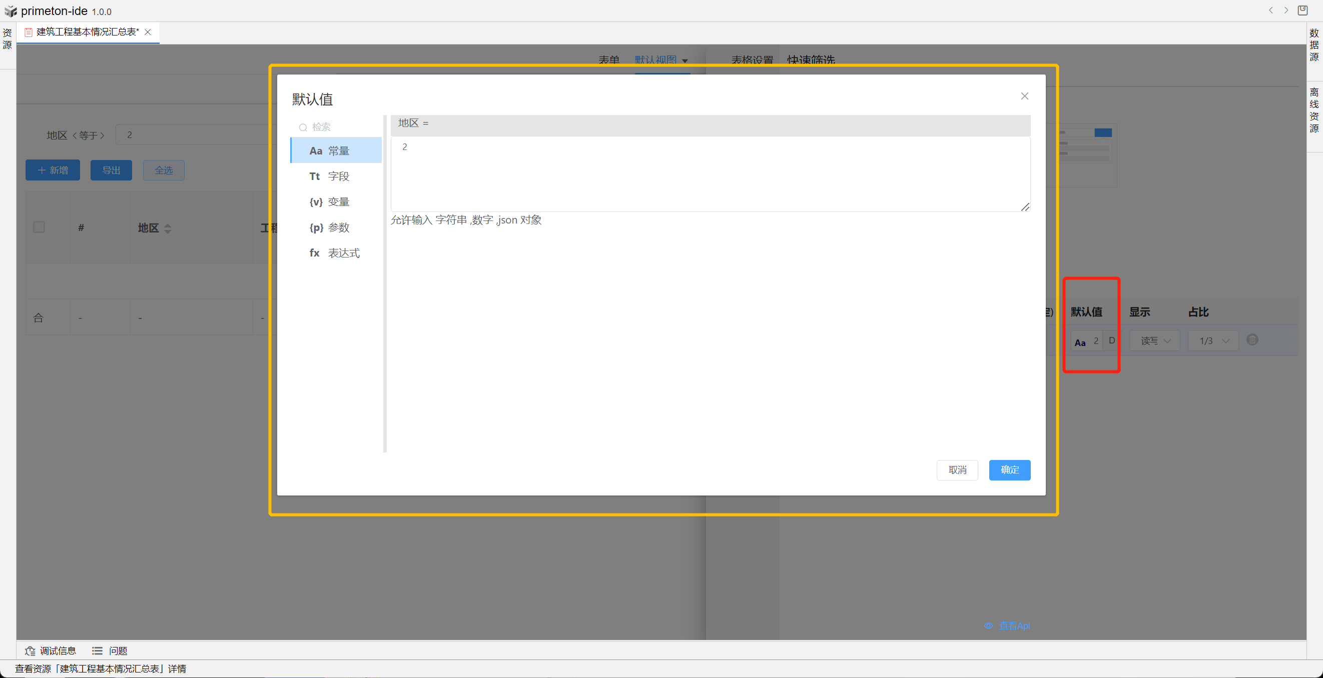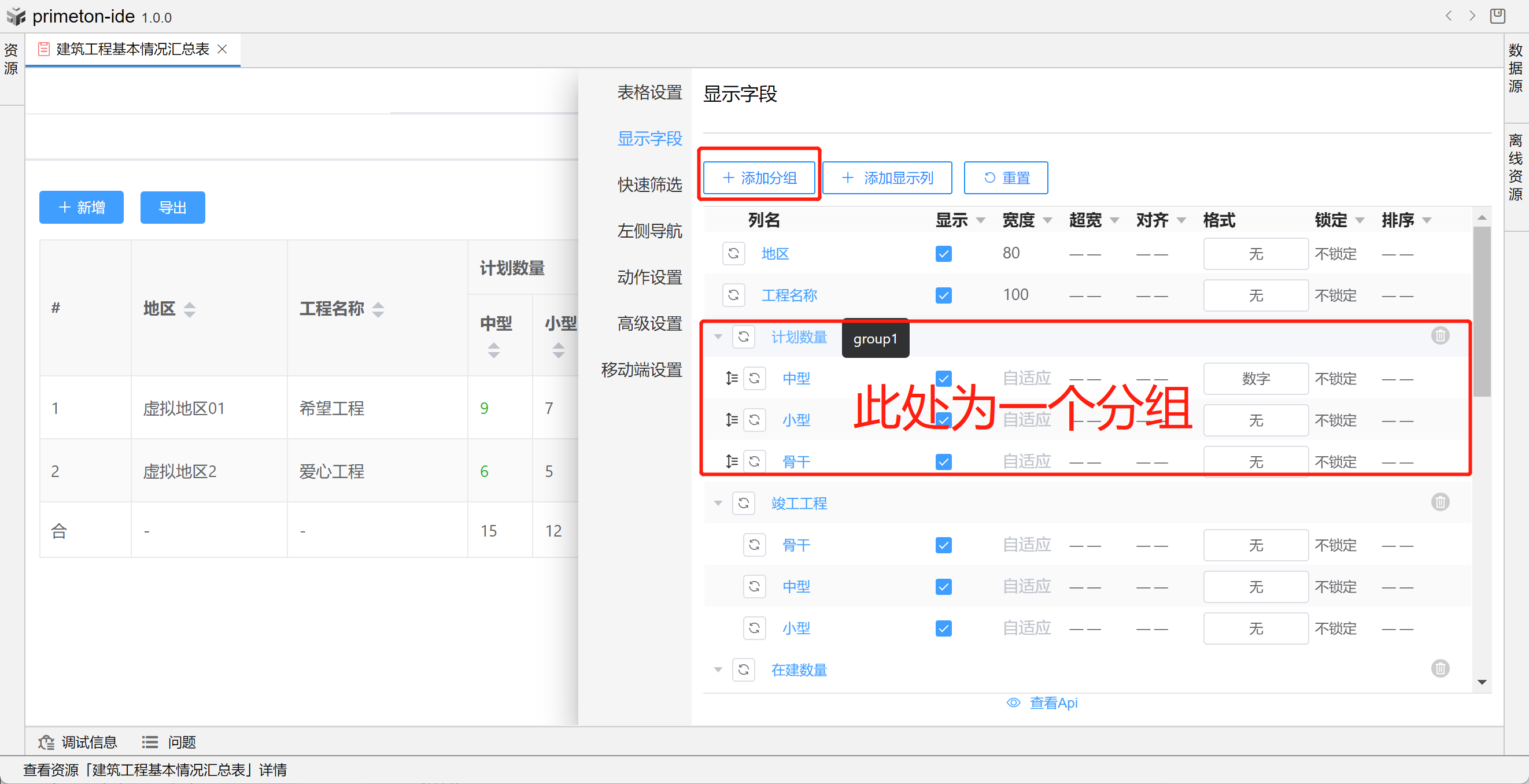 视图中table的格式可根据不同场景设置不同布局,本部分将以"建筑工程基本情况汇总表"为示例进行配置讲解