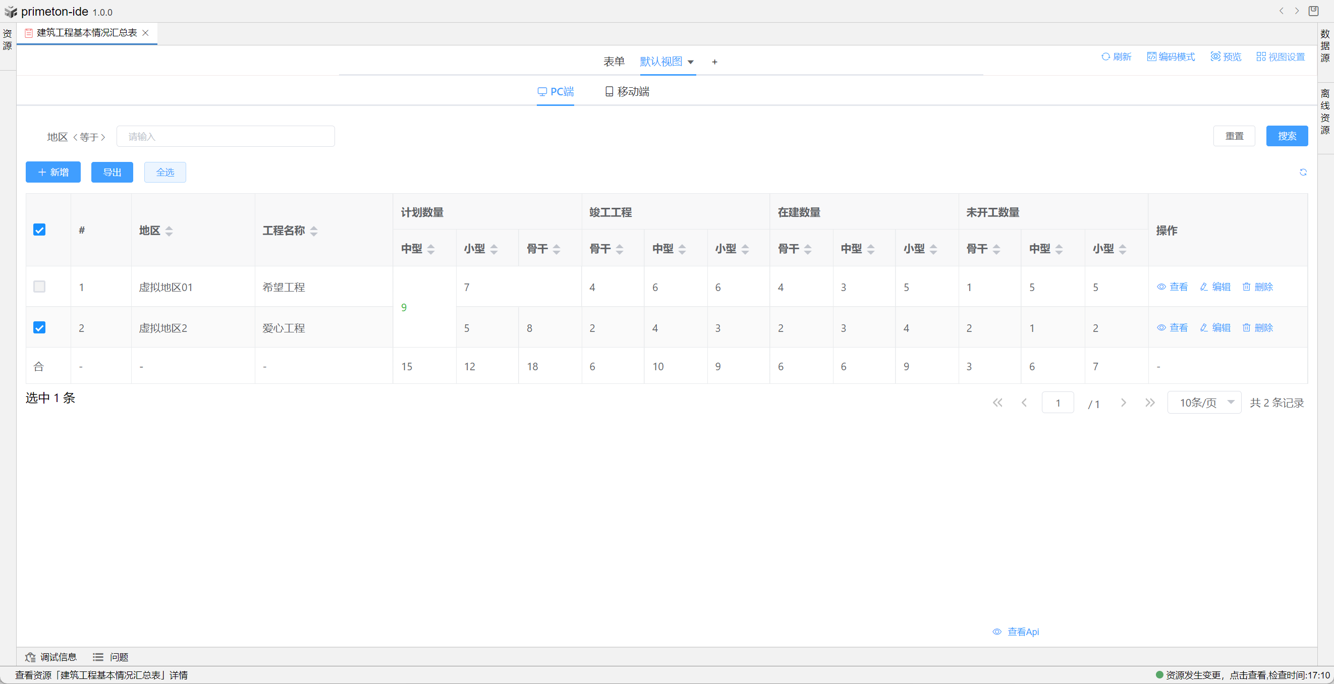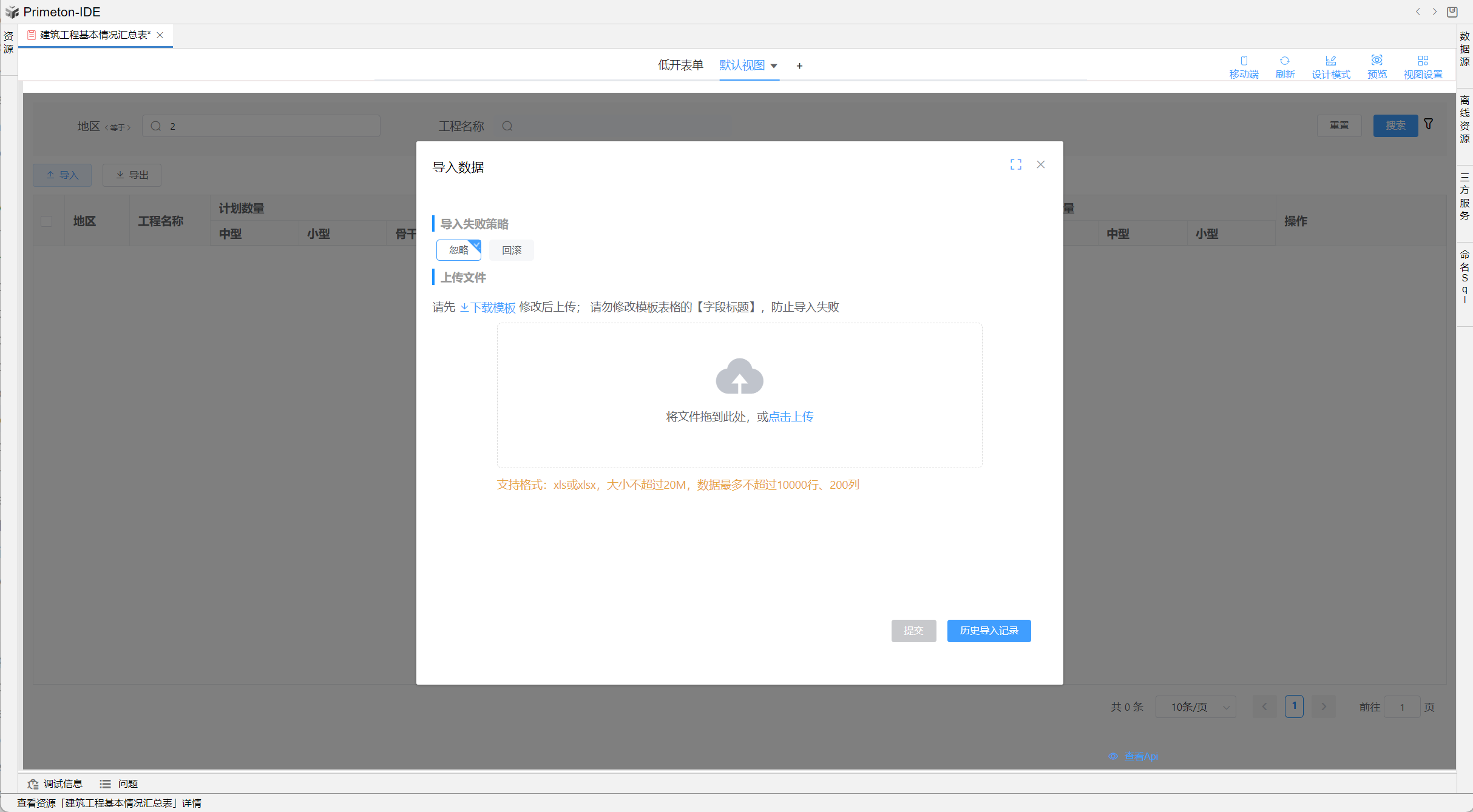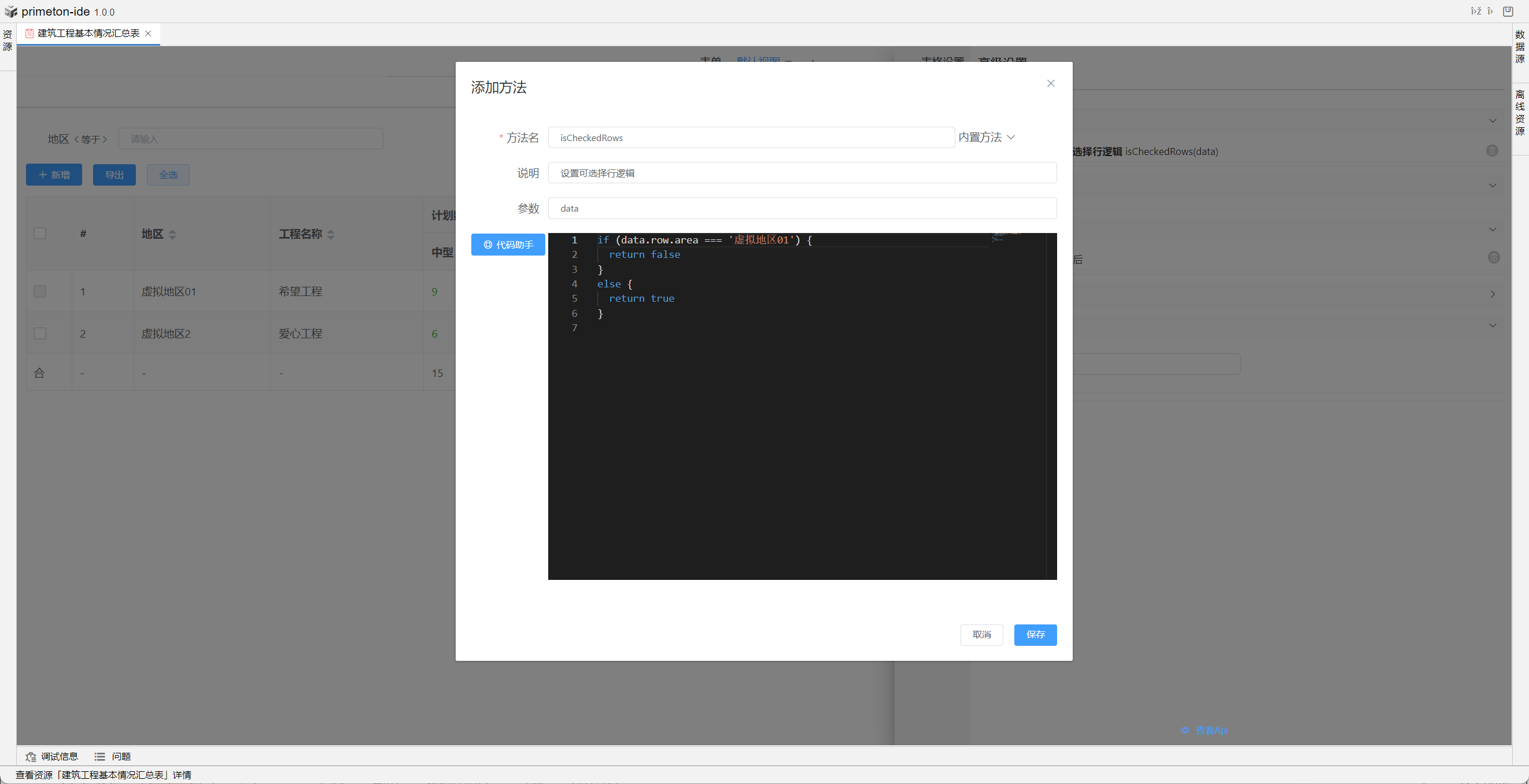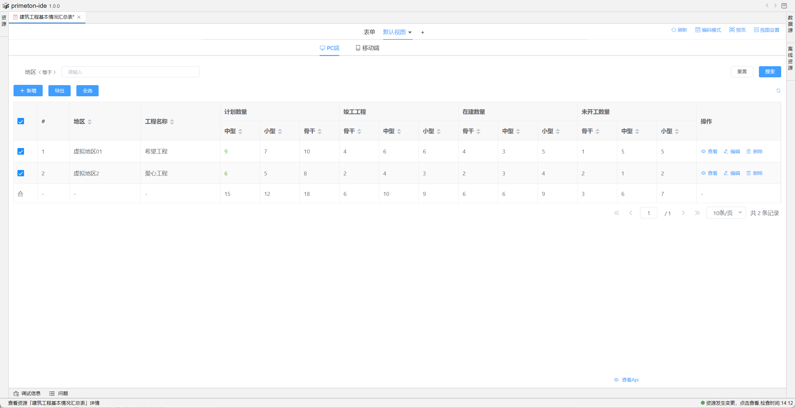 视图中table的格式可根据不同场景设置不同布局,本部分将以"建筑工程基本情况汇总表"为示例进行配置讲解