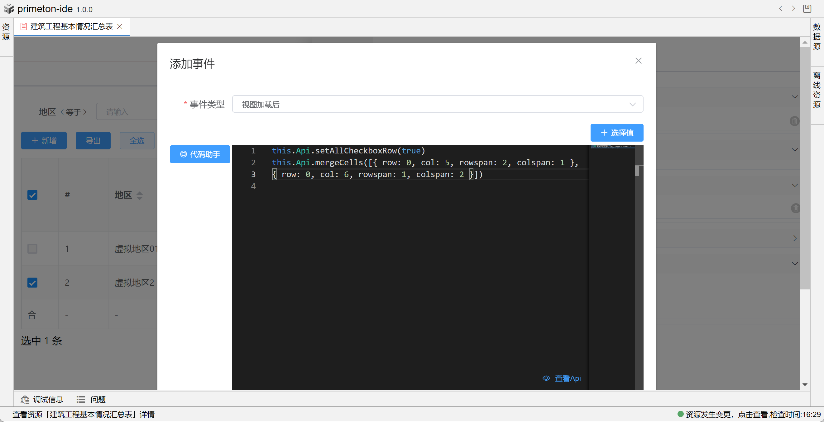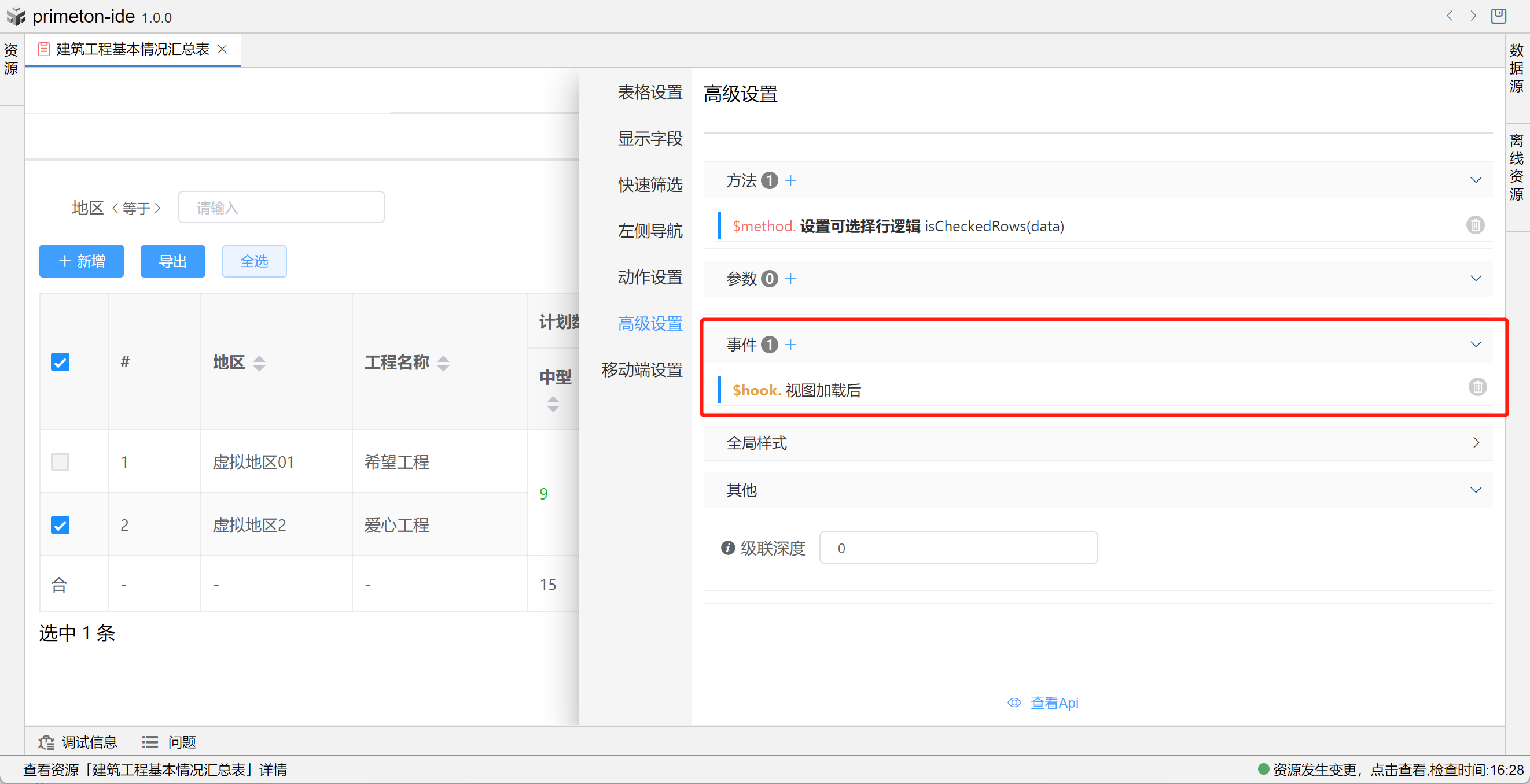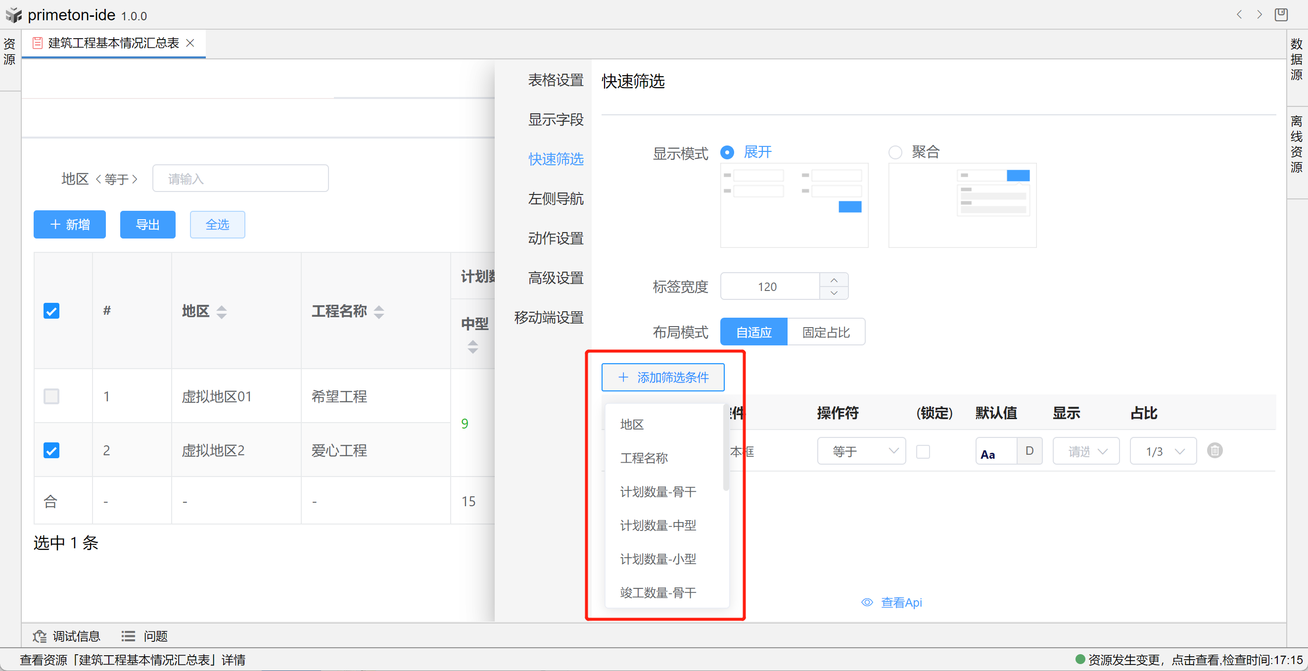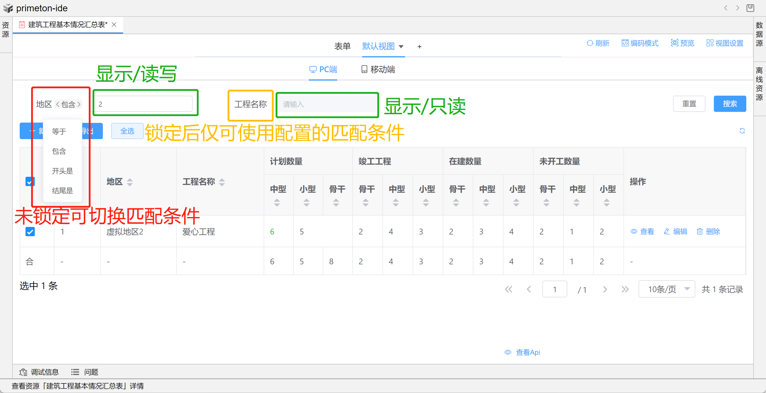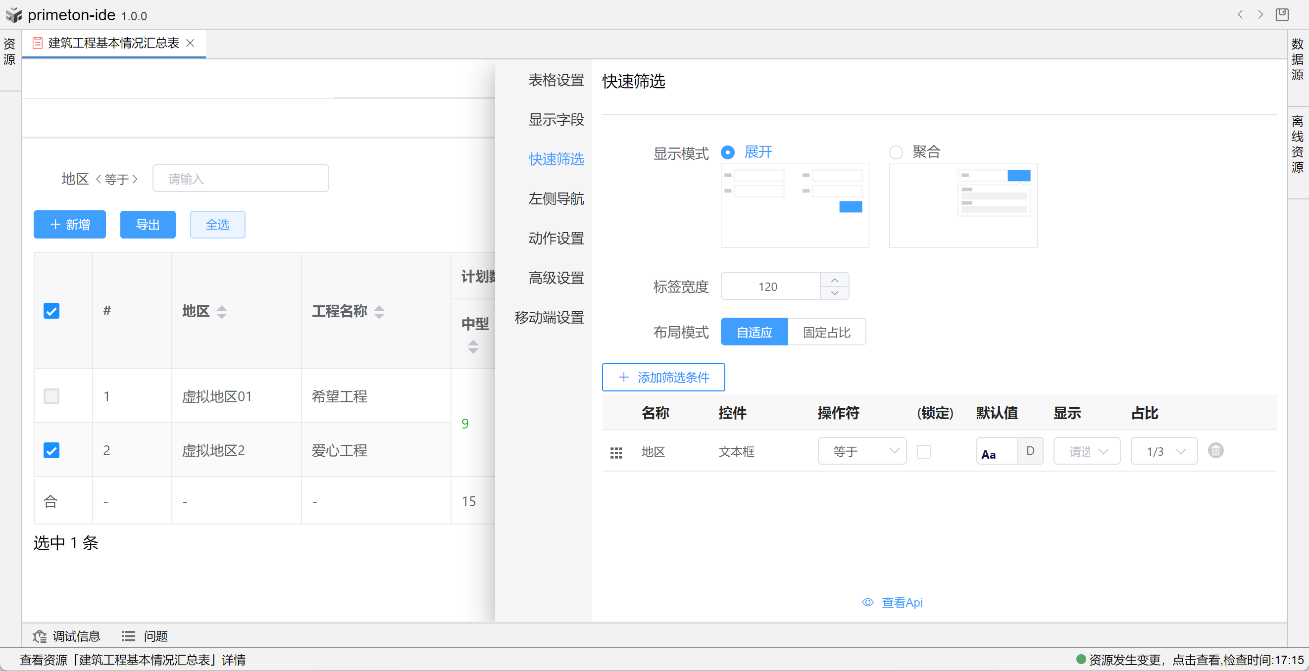 视图中table的格式可根据不同场景设置不同布局,本部分将以"建筑工程基本情况汇总表"为示例进行配置讲解