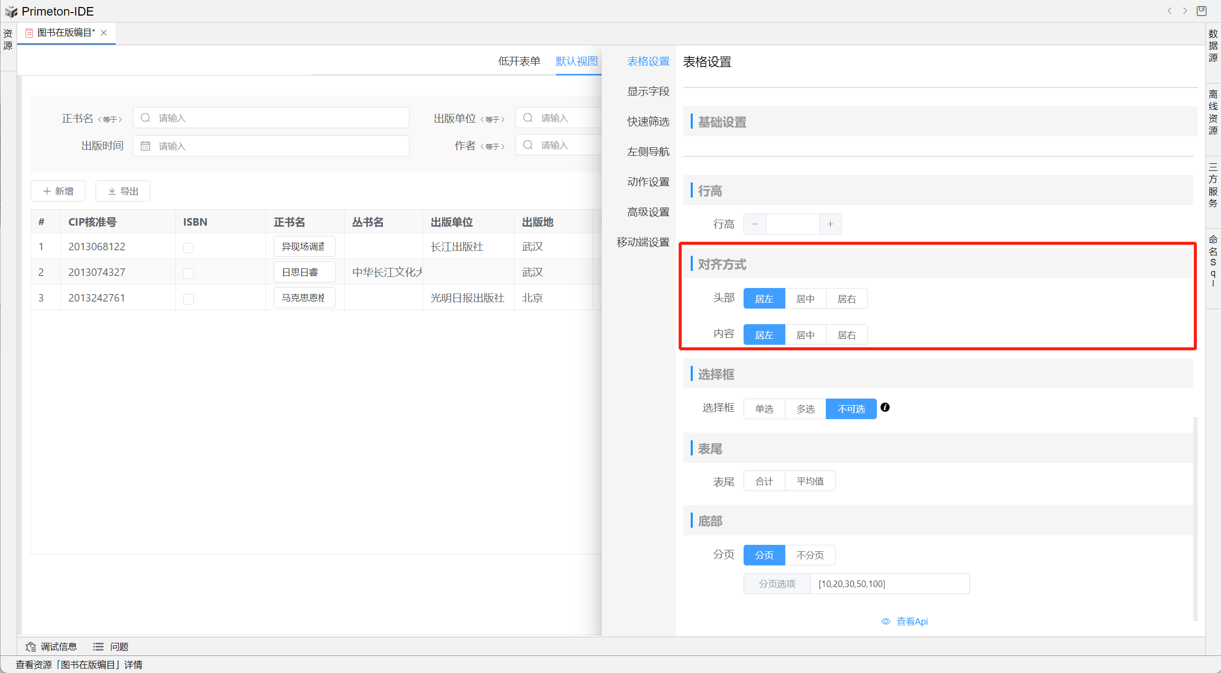 在视图设置中选择表格设置,可分别为表头和内容配置居左/居中/居右三种对齐。默认均为居左。